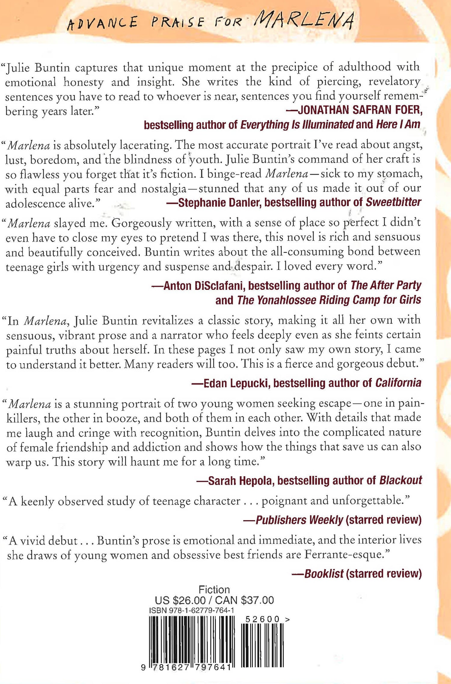 An electric debut novel about love, addiction, and loss; the story of two girls and the feral year that will cost one her life, and define the other’s for decadesEverything about fifteen-year-old Cat’s new town in rural Michigan is lonely and off-kilter, until she meets her neighbor, the manic, beautiful, pill-popping Marlena. Cat, inexperienced and desperate for connection, is quickly lured into Marlena’s orbit by little more than an arched eyebrow and a shake of white-blond hair. As the two girls turn the untamed landscape of their desolate small town into a kind of playground, Cat catalogues a litany of firsts—first drink, first cigarette, first kiss—while Marlena’s habits harden and calcify. Within the year, Marlena is dead, drowned in six inches of icy water in the woods nearby. Now, decades later, when a ghost from that pivotal year surfaces unexpectedly, Cat must try to forgive herself and move on, even as the memory of Marlena keeps her tangled in the past. Alive with an urgent, unshakable tenderness, Julie Buntin’s Marlena is an unforgettable look at the people who shape us beyond reason and the ways it might be possible to pull oneself back from the brink.