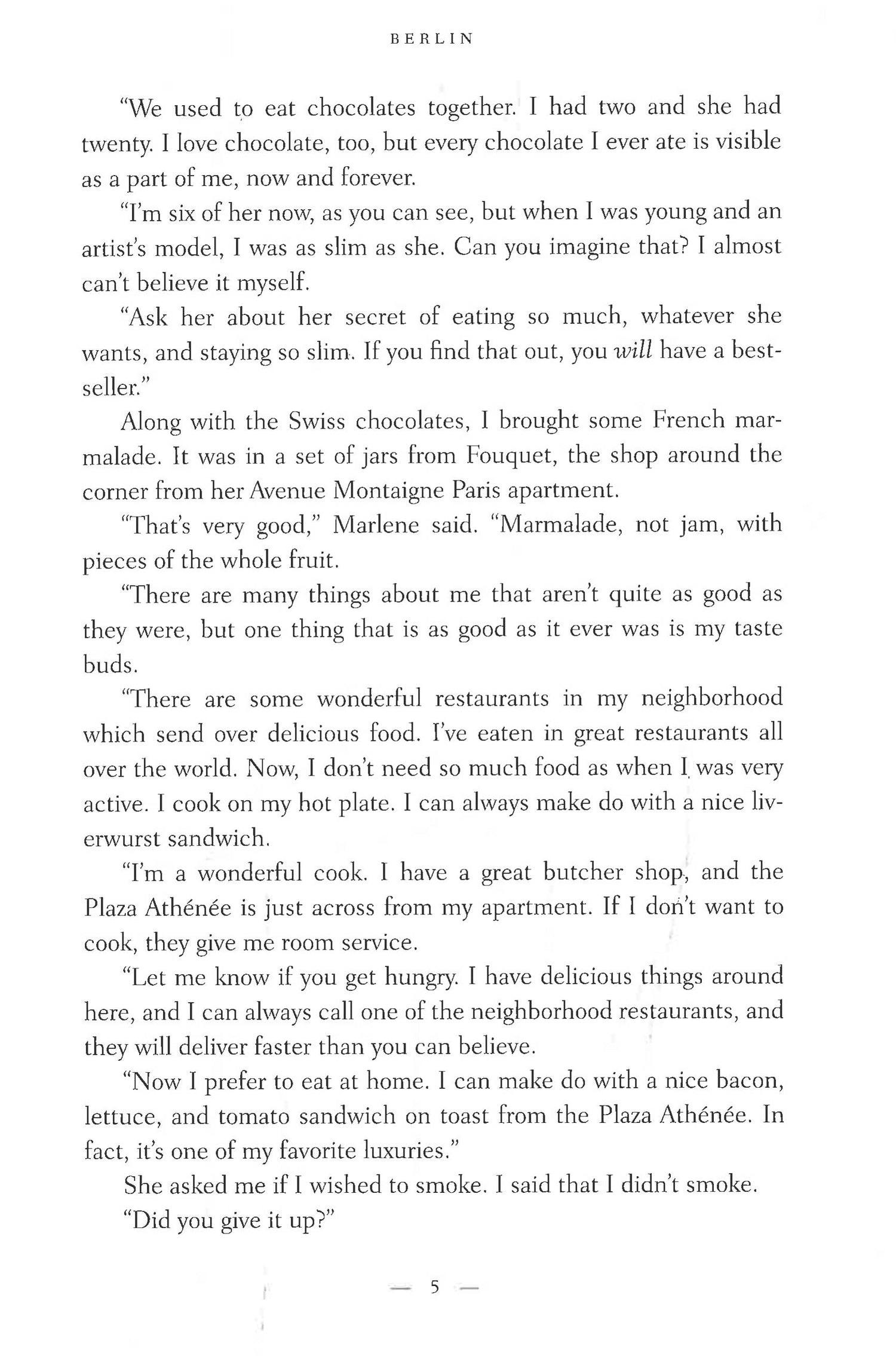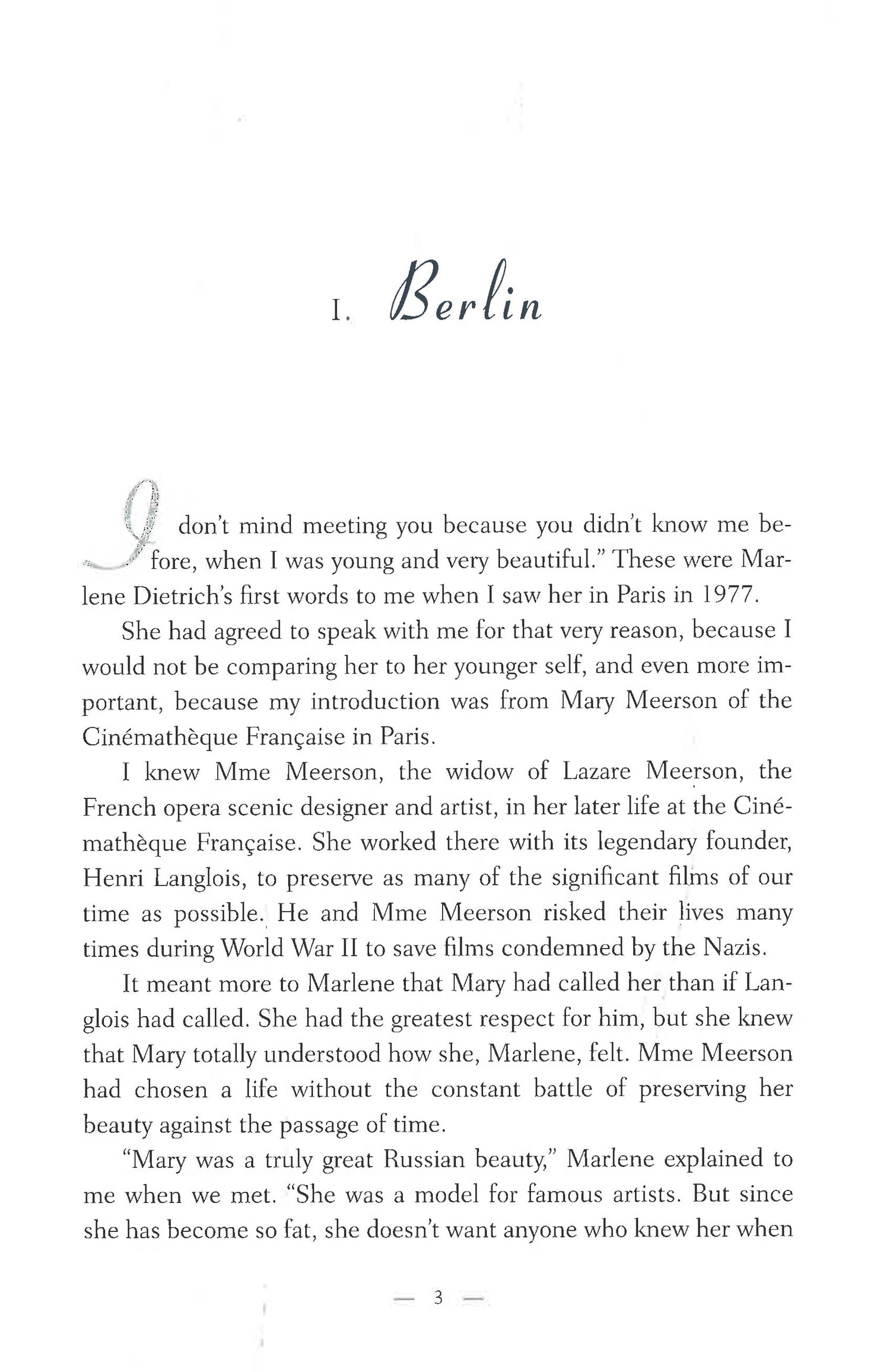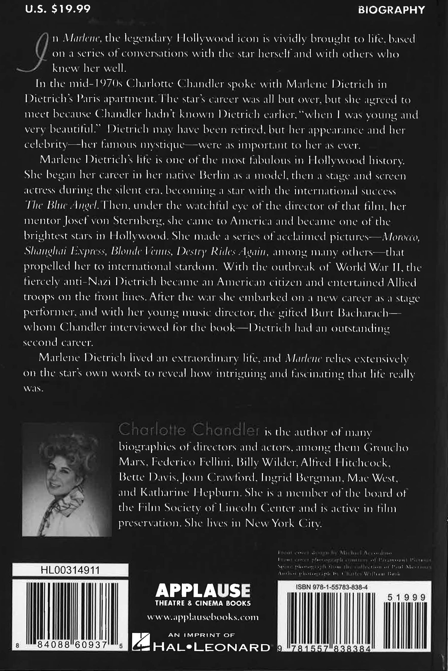 In Marlene, Hollywood legend Marlene Dietrich is vividly brought to life. In the mid-1970s Charlotte Chandler interviewed the reclusive actress in Dietrich's Paris apartment. The star's career was all but over, but she agreed to meet because Chandler hadn't known her earlier, "when âDietrichã was young and very beautiful." Marlene is further enriched by Chandler's interviews with others who knew Dietrich well, including Douglas Fairbanks, Jr., and Burt Bacharach. Chandler relates how Dietrich began her career in her native Berlin as a model, then a stage and screen actress during the silent era, becoming a star with The Blue Angel, then moving on to become one of the brightest lights in Hollywood. Prior to World War II, the fiercely anti-Nazi Dietrich resisted Hitler's flattering invitations to return to Germany and became an American citizen instead, later entertaining Allied troops on the front lines. After the war, she embarked on a new, outstanding second career as a stage performer. Dietrich had a strict Prussian upbringing, but she refused to be constrained by society's expectations. She spoke candidly with Chandler about her unconventional marriage; she and her husband both had affairs, each with the other's consent. She even expressed warm feelings toward her husband's mistress. Marlene Dietrich lived an extraordinary life, and Marlene relies extensively on the star's own words to reveal how intriguing and fascinating that life really was.