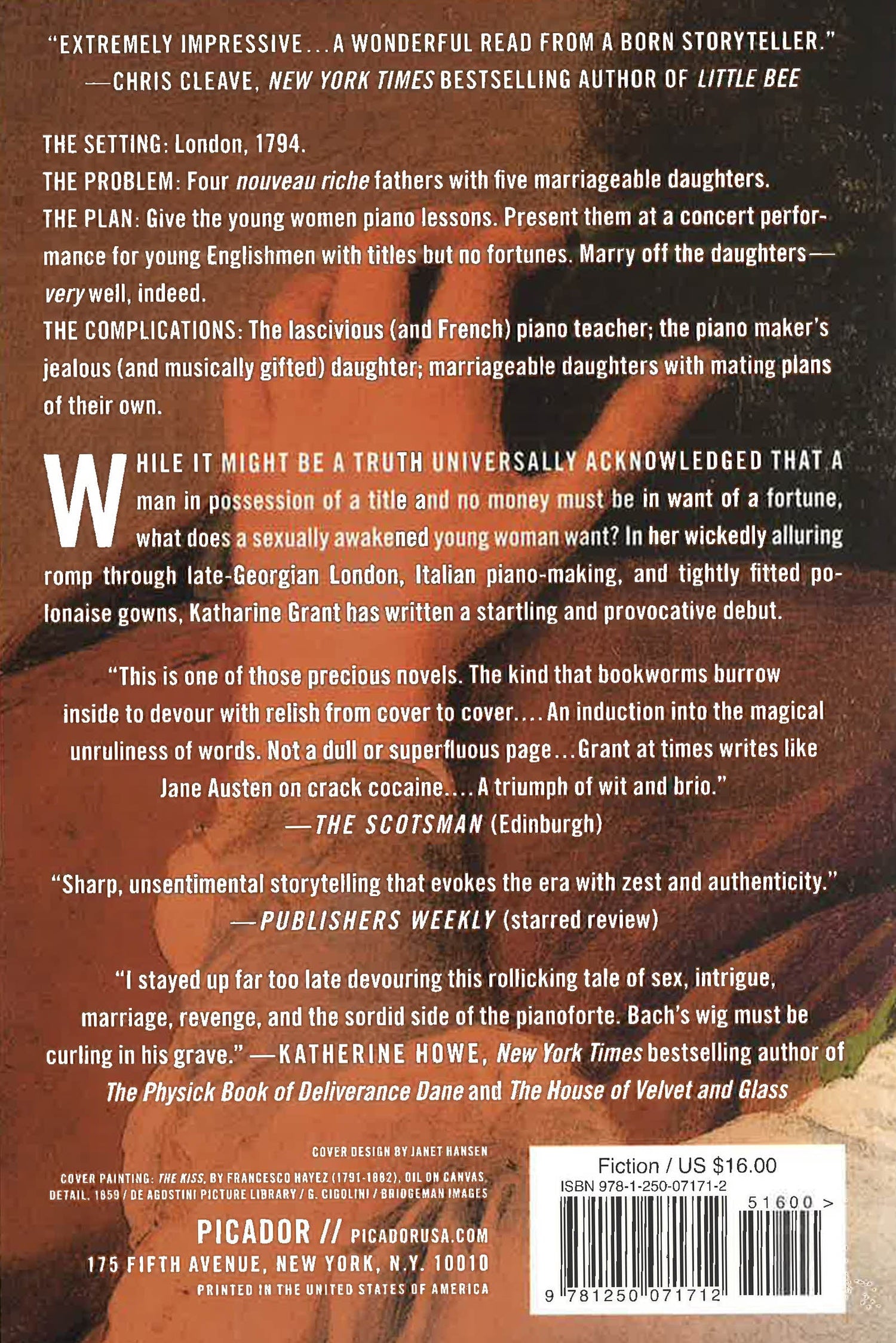 Extremely impressive . . . . A wonderful read from a born storyteller. -Chris Cleave, New York Times bestselling author of Little Bee The setting: London, 1794. The problem: Four nouveau riche fathers with five marriageable daughters. The plan: Give the young women piano lessons. Present them at a concert performance for young Englishmen with titles but no fortunes. Marry off the daughters-very well, indeed. The complications: The lascivious (and French) piano teacher; the piano maker's jealous (and musically gifted) daughter; marriageable daughters with mating plans of their own. While it might be a truth universally acknowledged that a man in possession of a title and no money must be in want of a fortune, what does a sexually awakened young woman want? In her wickedly alluring romp through late-Georgian London, Italian piano-making, and tightly fitted polonaise gowns, Katharine Grant has written a startling and provocative debut.