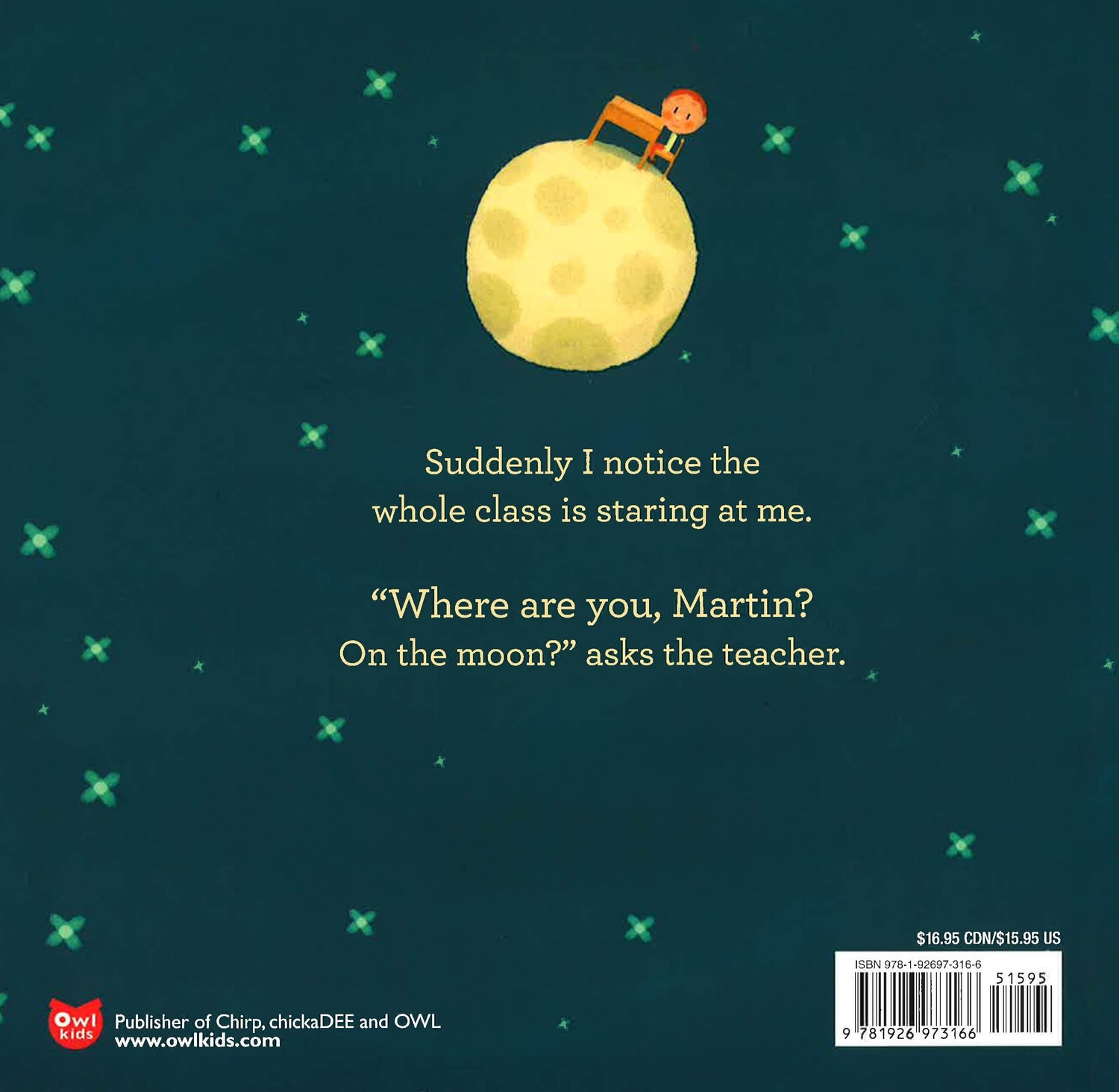 An active daydreamer, Martin can't help his mind from wandering on the first day of school. His teacher's waving arms remind him of the seagulls that fly along the river banks, which reminds him of a summer trip he took with his mother, which reminds him of a poem he wrote, which reminds him... When his teacher gently calls him back to Earth, Martin is embarrassed about his inattention. But when his whole class laughs along with him, Martin happily realizes that his imagination can help him make friends and have fun at school. The spirit of this whimsical story comes alive through the pairing of inquisitive and unexpected words and simple yet surreal illustrations. Nominated for the Prix TD de litterature canadienne pour l'enfance et la jeunesse in its original French, "Martin on the Moon" explores the poetry, beauty, and possibility of the first day of school.