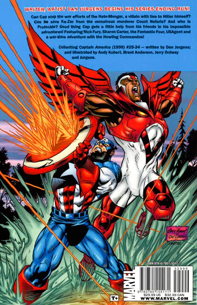 Dan Jurgens begins his legendary run on Captain America! Can Cap stop the war efforts of the Hate-Monger, a villain with ties to Hitler himself? Can he save Ka-Zar from the monstrous murderer Count Nefaria? And who is Protocide? Good thing Cap has some friends to help him in his impossible adventures! Featuring Nick Fury, Sharon Carter, the Fantastic Four, USAgent and a war-time adventure with the Howling Commandos!