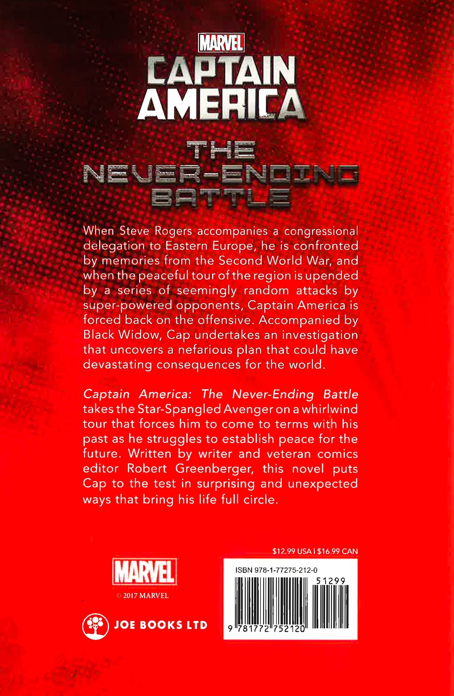 When Steve Rogers accompanies a congressional delegation to Eastern Europe, he is confronted by memories from the Second World War, and when the peaceful tour of the region is upended by a series of seemingly random attacks by super-powered opponents, Captain America is forced back on the offensive. Accompanied by Black Widow, Cap undertakes an investigation that uncovers a nefarious plan that could have devastating consequences for the world. Captain America: The Never-Ending Battle takes the Star-Spangled Avenger on a whirlwind tour that forces him to come to terms with his past as he struggles to establish peace for the future. Written by writer and veteran comics editor Robert Greenberger, this novel puts Cap to the test in surprising and unexpected ways that bring his life full circle.