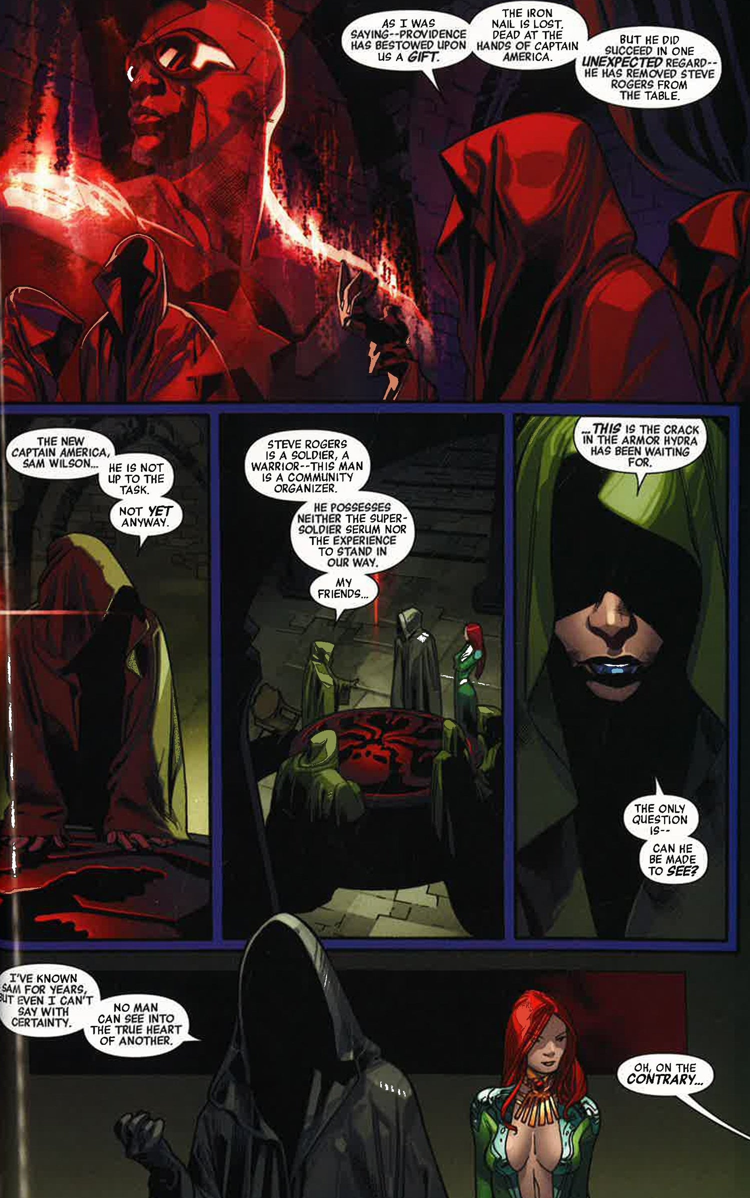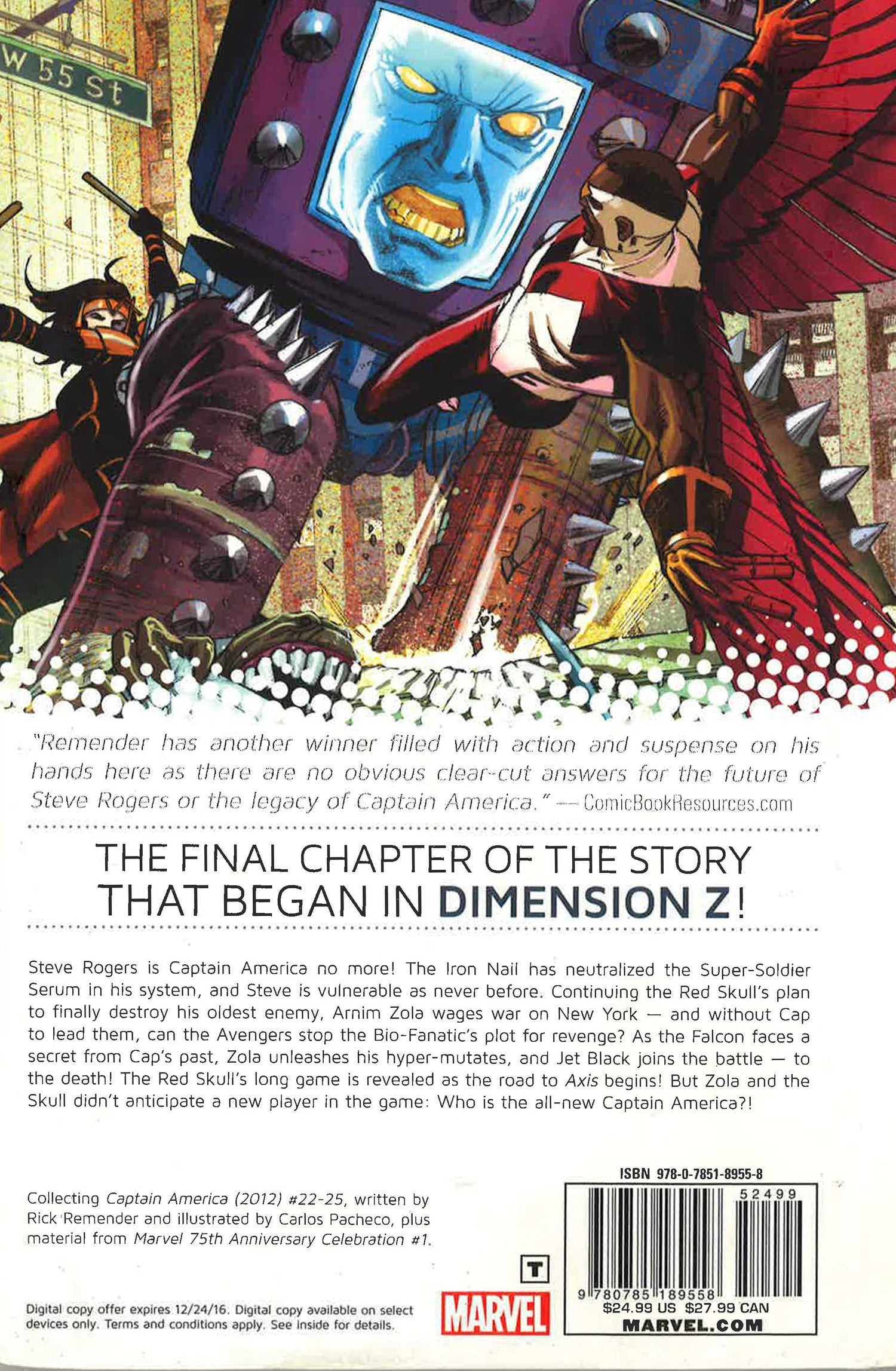 This is it! The final chapter of the story that began in Dimension Z! After Cap's earth-shaking battle against the Iron Nail, Steve Rogers is Captain America no more! But can he survive his new situation as a face from the past hunts him? Meanwhile, two of Cap's oldest foes continue their plan: Arnim Zola and the Red Skull! Zola wages war on New York, but without Cap to lead them, can the Avengers stop the Bio-Fanatic's plot for revenge? As the Falcon faces a secret from Cap's past, Zola unleashes his hyper-mutates, and Jet Black joins the battle...to the death! The Red Skull's long game is revealed as the road to AXIS begins! But Zola and the Skull didn't anticipate a new player in the game: who is the all-new Captain America?