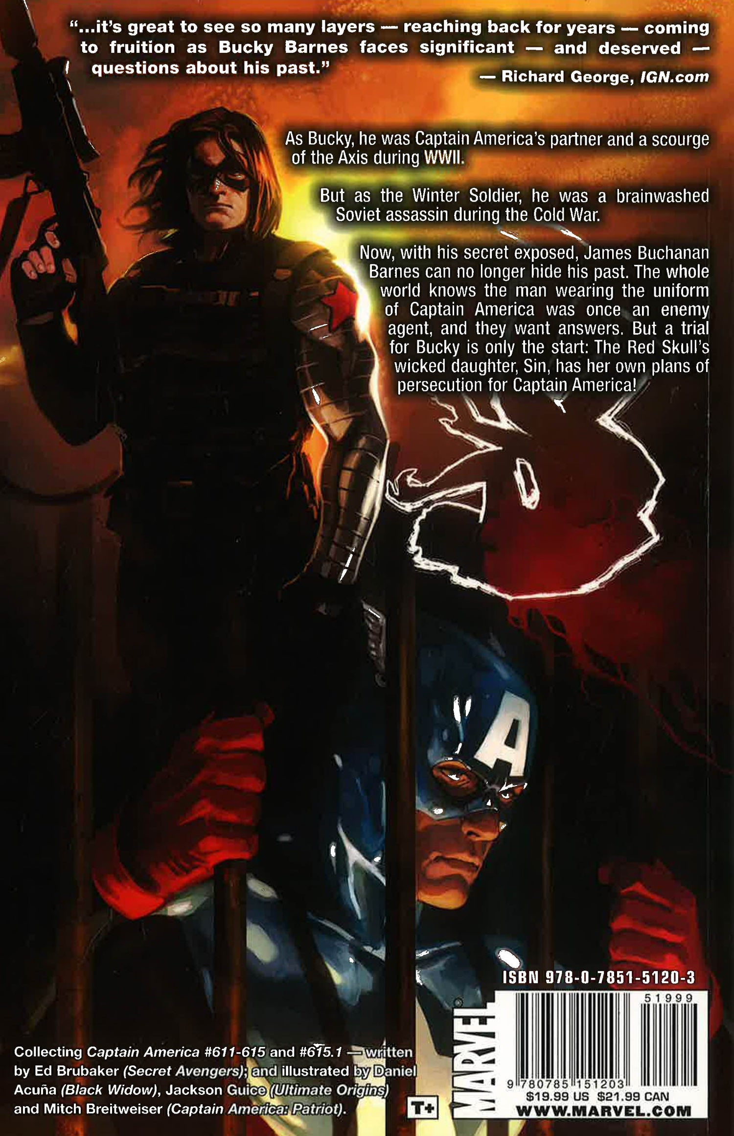 As Bucky, he was Captain America's partner and a scourge of the Axis during WWII. But as the Winter Soldier, he was a brainwashed Soviet assassin during the Cold War. Now, with his secret exposed, James Buchanan Barnes can no longer hide his past. The whole world knows the man wearing the uniform of Captain America was once an enemy agent, and they want answers. But a trial for Bucky is only the start: The Red Skull's wicked daughter, Sin, has her own plans of persecution for Captain America! Collecting Captain Amerika (1968) #611-615 and #615.1.