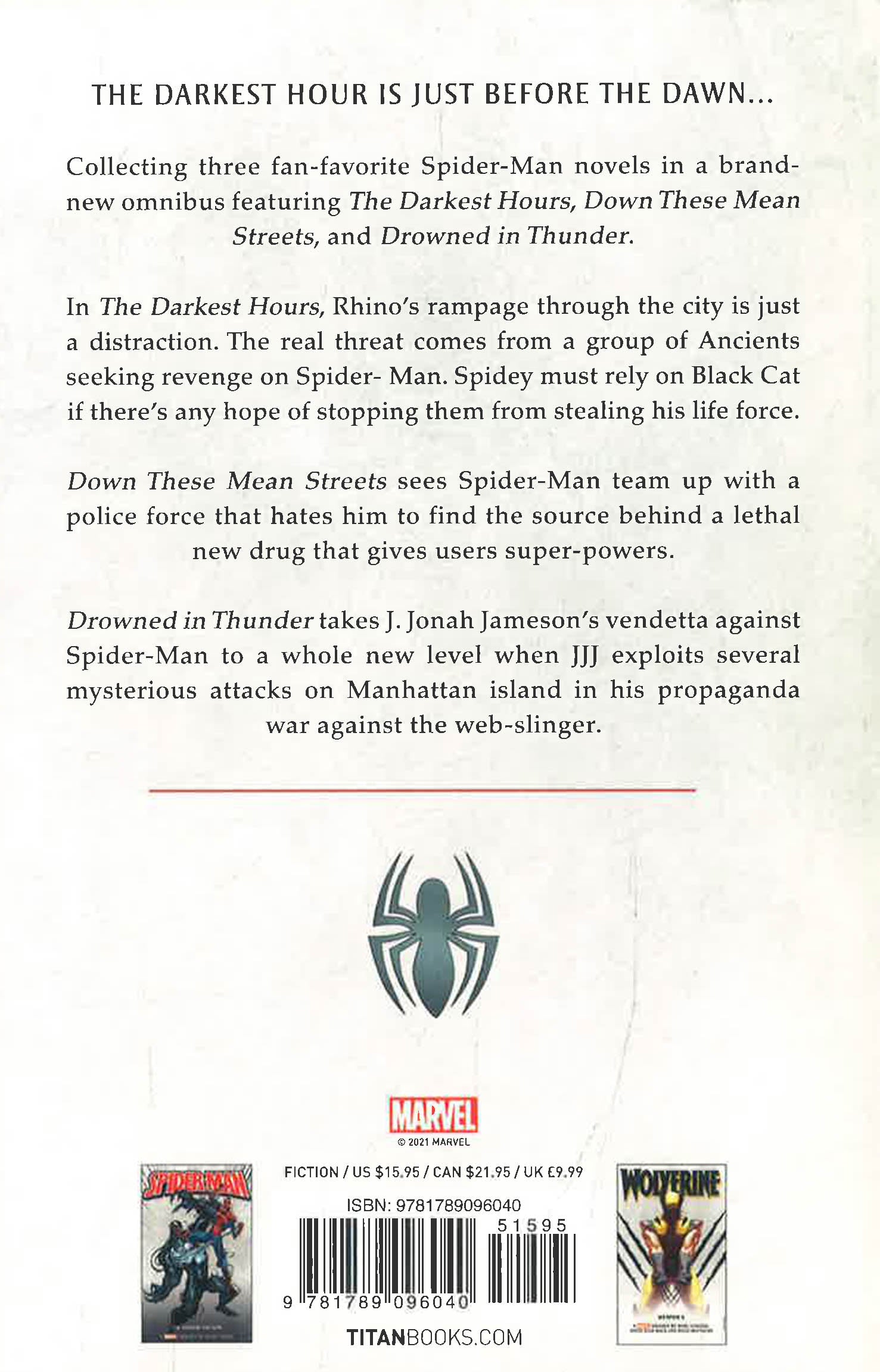 Collecting three fan-favorite Spider-Man novels in a brand-new omnibus featuring The Darkest Hours, Down These Mean Streets, and Drowned in Thunder.