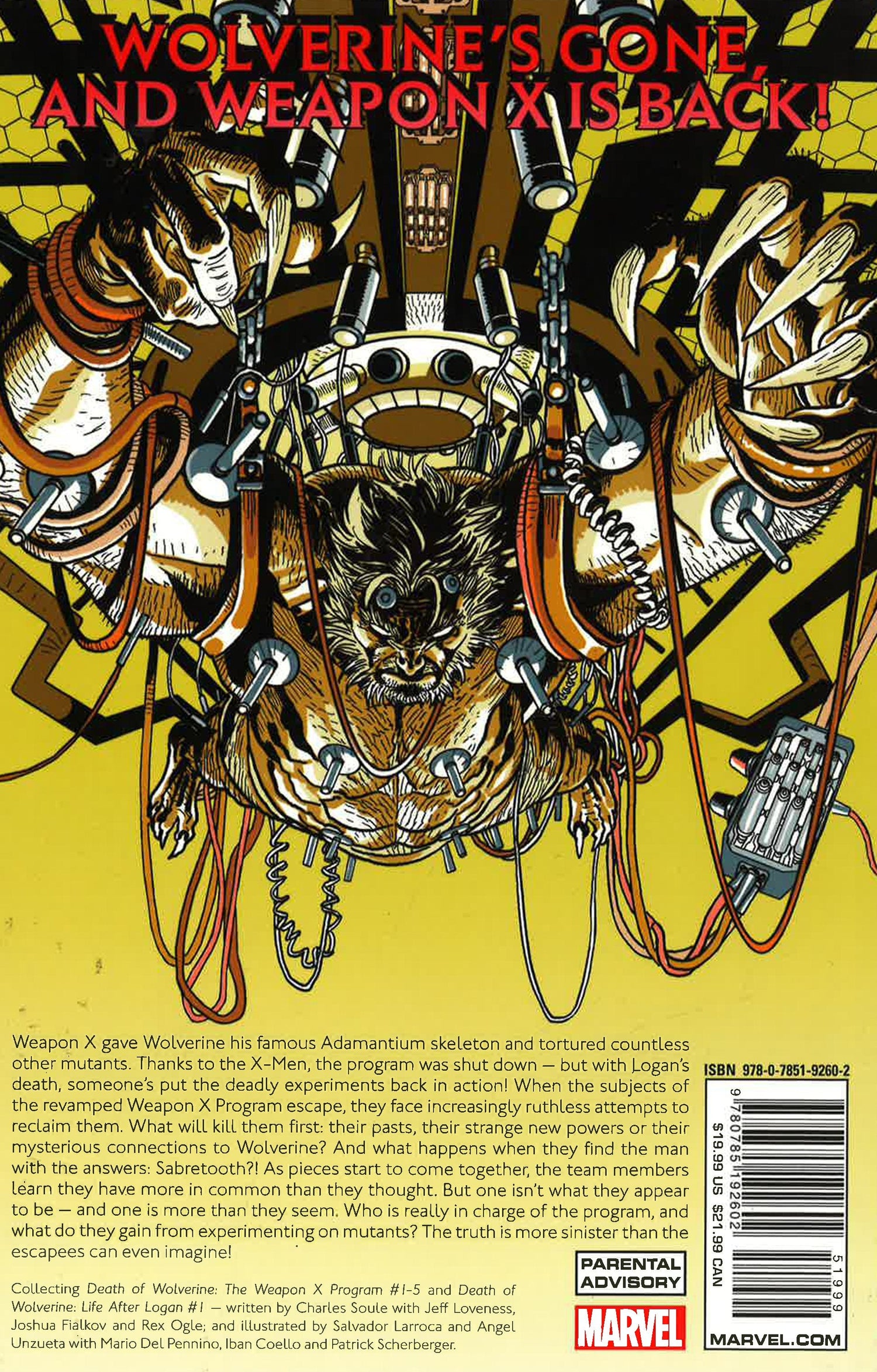 Desperate Flight! The escaped subjects of the revamped Weapon X program flee increasingly deadly attempts to bring them back under control. What will kill them first - their pasts, their strange new powers, or their mysterious connection to the Wolverine? Collecting Death Of Wolverine: The Weapon X Program 1-5, Death of Wolverine: Life After Logan 1 *This book may have remainder mark*