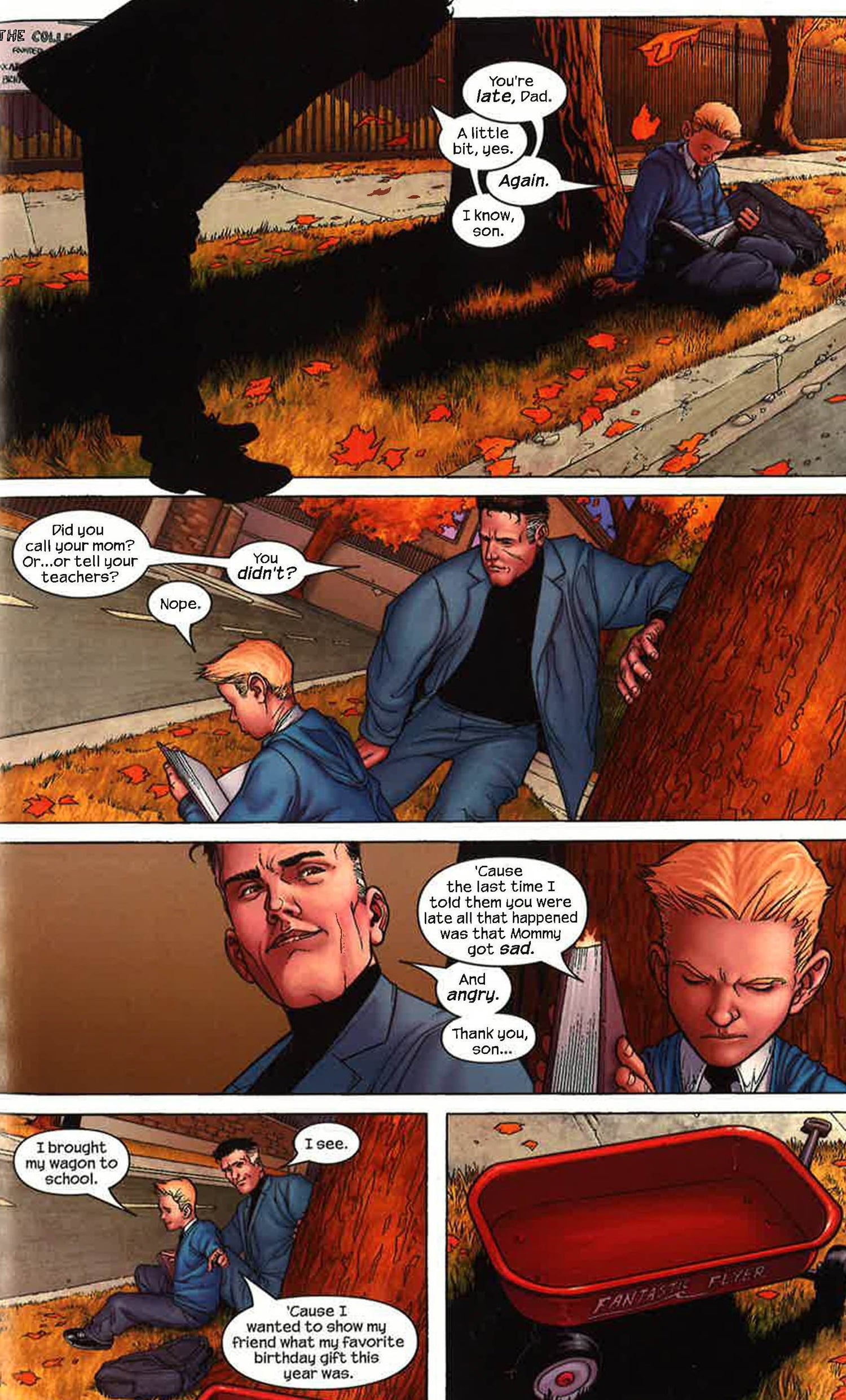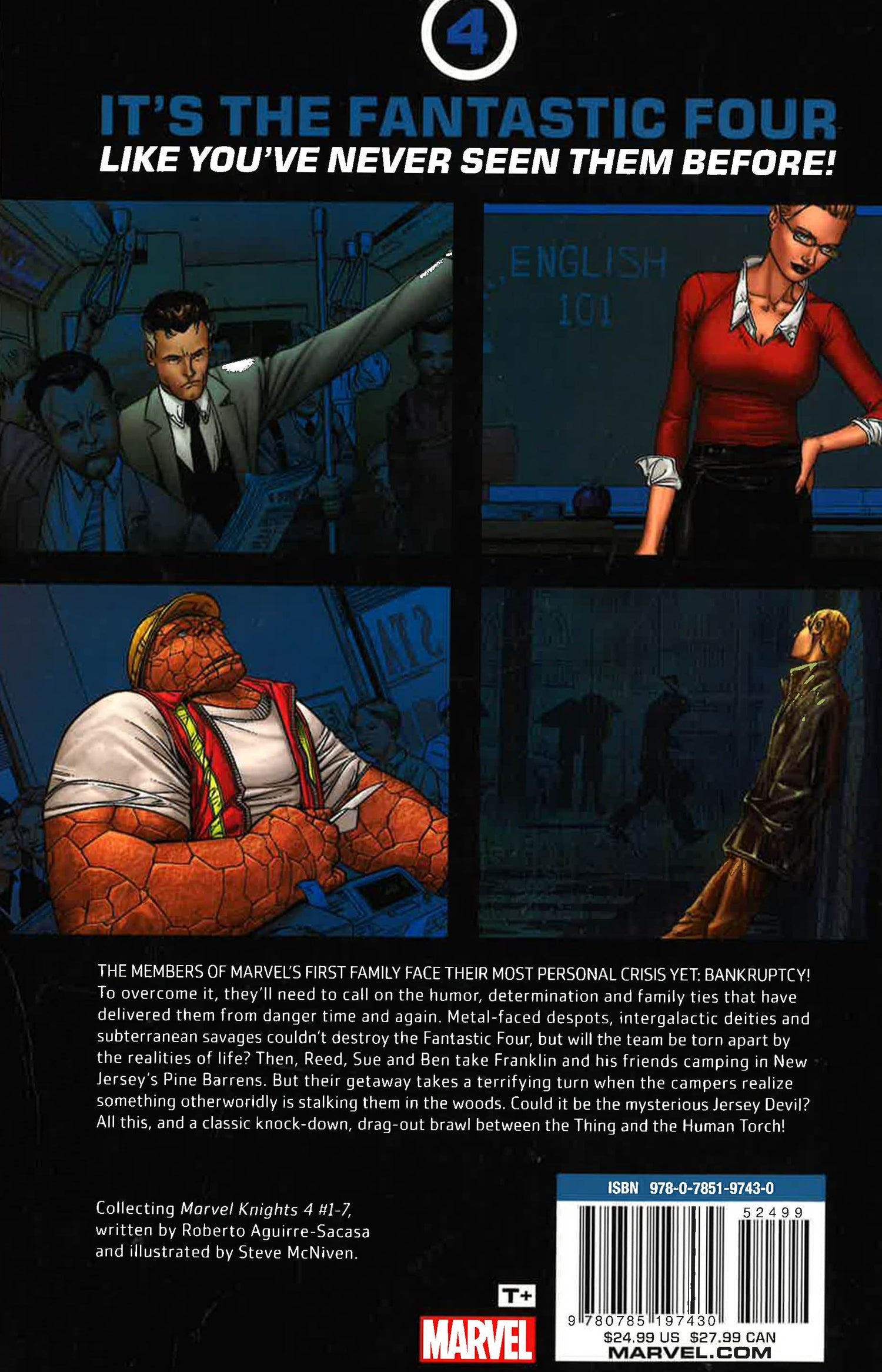 It's the Fantastic Four like you've never seen them before, courtesy of comics superstars Roberto Aguirre-Sacasa and Steve McNiven! Marvel's first family faces its most personal crisis yet: bankruptcy! To overcome it, they'll need to call on the humor, determination and family ties that have delivered them from danger time and time again. Metal-faced despots, intergalactic deities and subterranean savages couldn't destroy the Fantastic Four, but will the team be torn apart by the realities of life? Then, Reed, Sue and Ben take Franklin and his friends camping in New Jersey's Pine Barrens. But their getaway takes a terrifying turn when the campers realize that something otherworldly is stalking them in the woods.