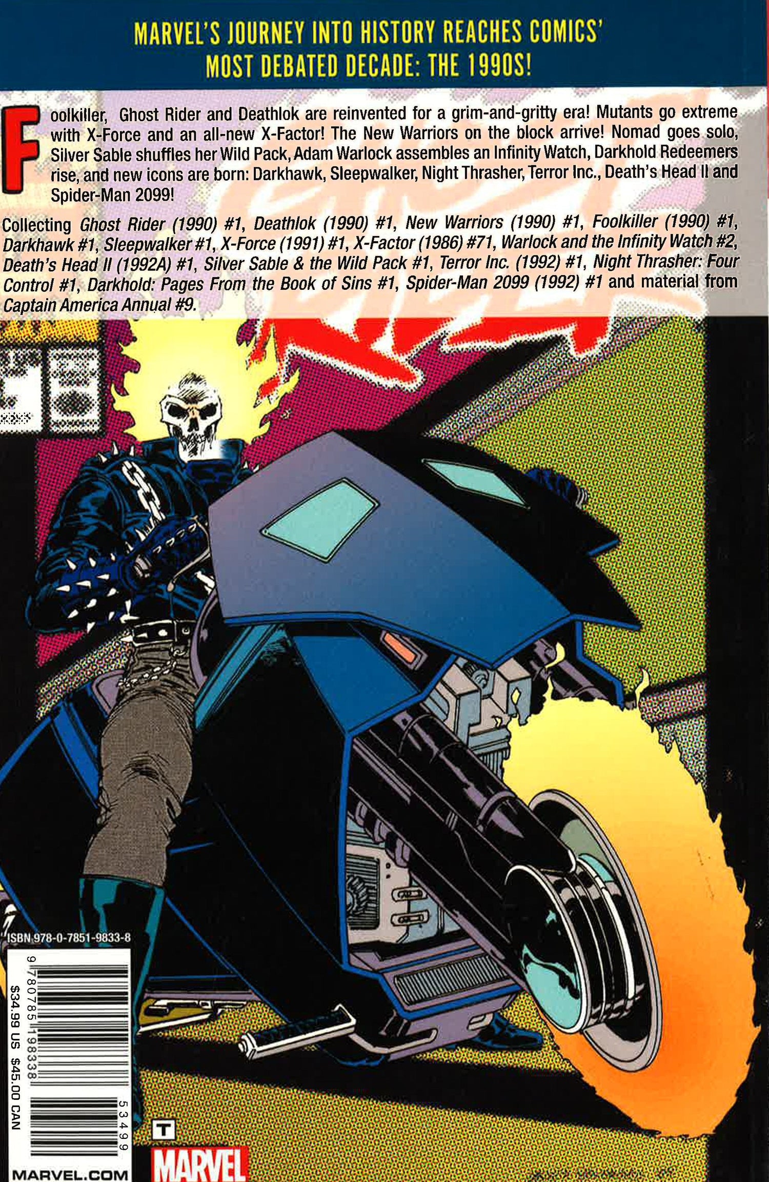 Marvel's journey into history reaches comics' most debated decade: the 1990s! Ghost Rider, Deathlok and Foolkiller are reinvented for a grim and gritty era! Mutants go extreme with X-Force and an all-new X-Factor! The New Warriors on the block arrive! Nomad goes solo, Silver Sable shuffles her Wild Pack, Adam Warlock assembles an Infi nity Watch, Darkhold Redeemers rise, and new icons are born. COLLECTING: Ghost Rider (1990) 1, Deathlok (1990) 1, New Warriors (1990) 1, Foolkiller (1990) 1, Darkhawk 1, Sleepwalker 1, X-Force (1991) 1, X-Factor (1986) 71, Warlock and the Infinity Watch 2, Death's Head II (1992a) 1, Silver Sable and the Wild Pack #1, Terror Inc. (1992) #1, Night Thrasher: Four Control #1, Darkhold: Pages From the Book of Sins #1, Spider-Man 2099 (1992) #1 and material from Captain America Annual #9