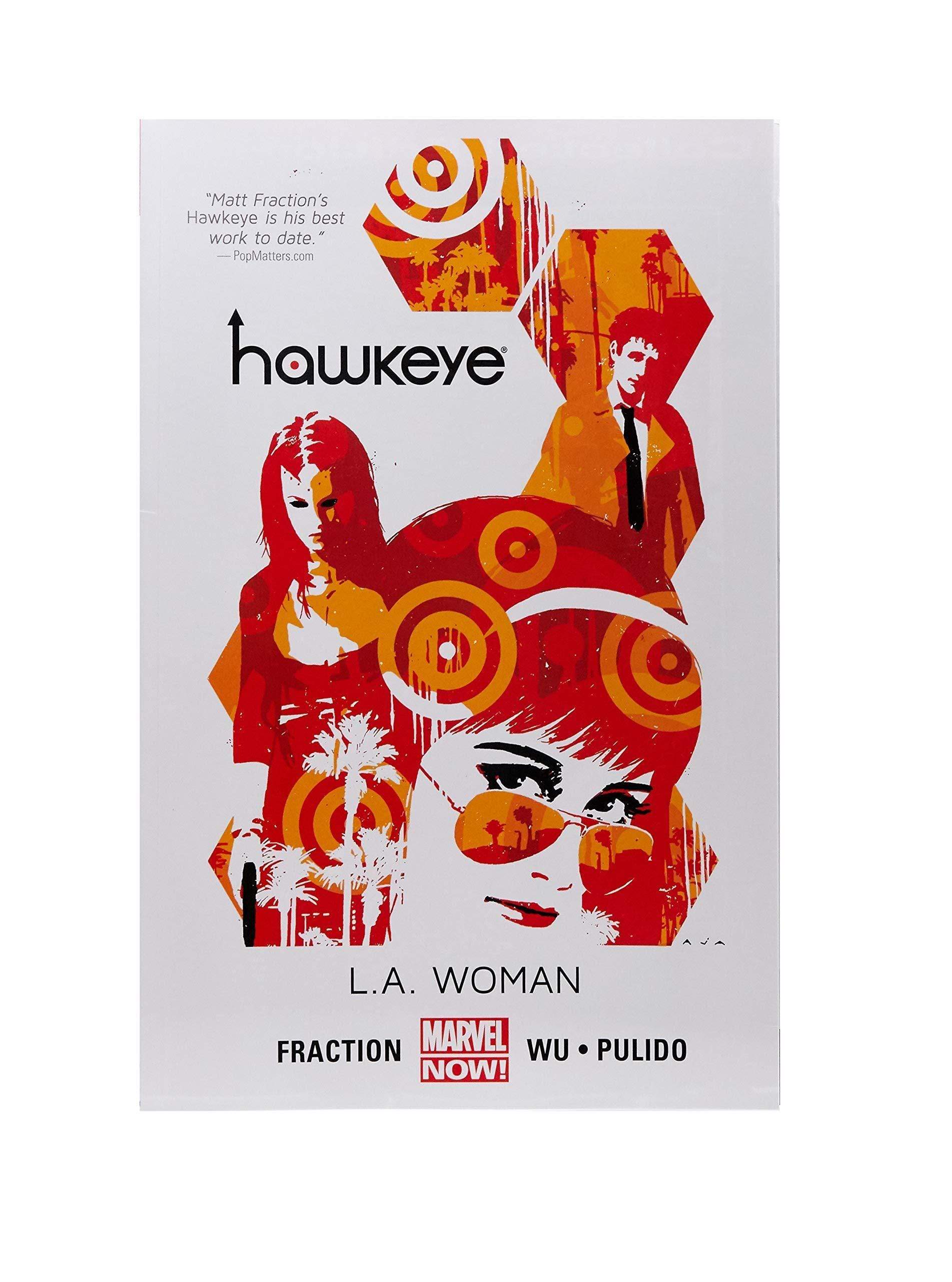 Kate Bishop heads to Los Angeles to get away from New York, life, and Clint Barton - but not away from trouble! Because Madame Masque is hanging out at poolside with the rich and famous as well! As Kate helps a reclusive and Sixties-damaged pop music genius find his lost masterpiece, Madame Masque finds Kate. By which we mean starts trying to kill her again. This one has it all! Characters! Plot! Story! Dialogue! Theme! Meaning! Message! Action! A little exposition! Fire! Arrows! Criminals! Neighbors! Large bodies of water! Clients! Cops who don't care! A system that victimizes the victims! The dog! In a broken town where cynicism and apathy has its claws around the throat of the good and decent, Lady Hawkguy is the only hero you can trust!