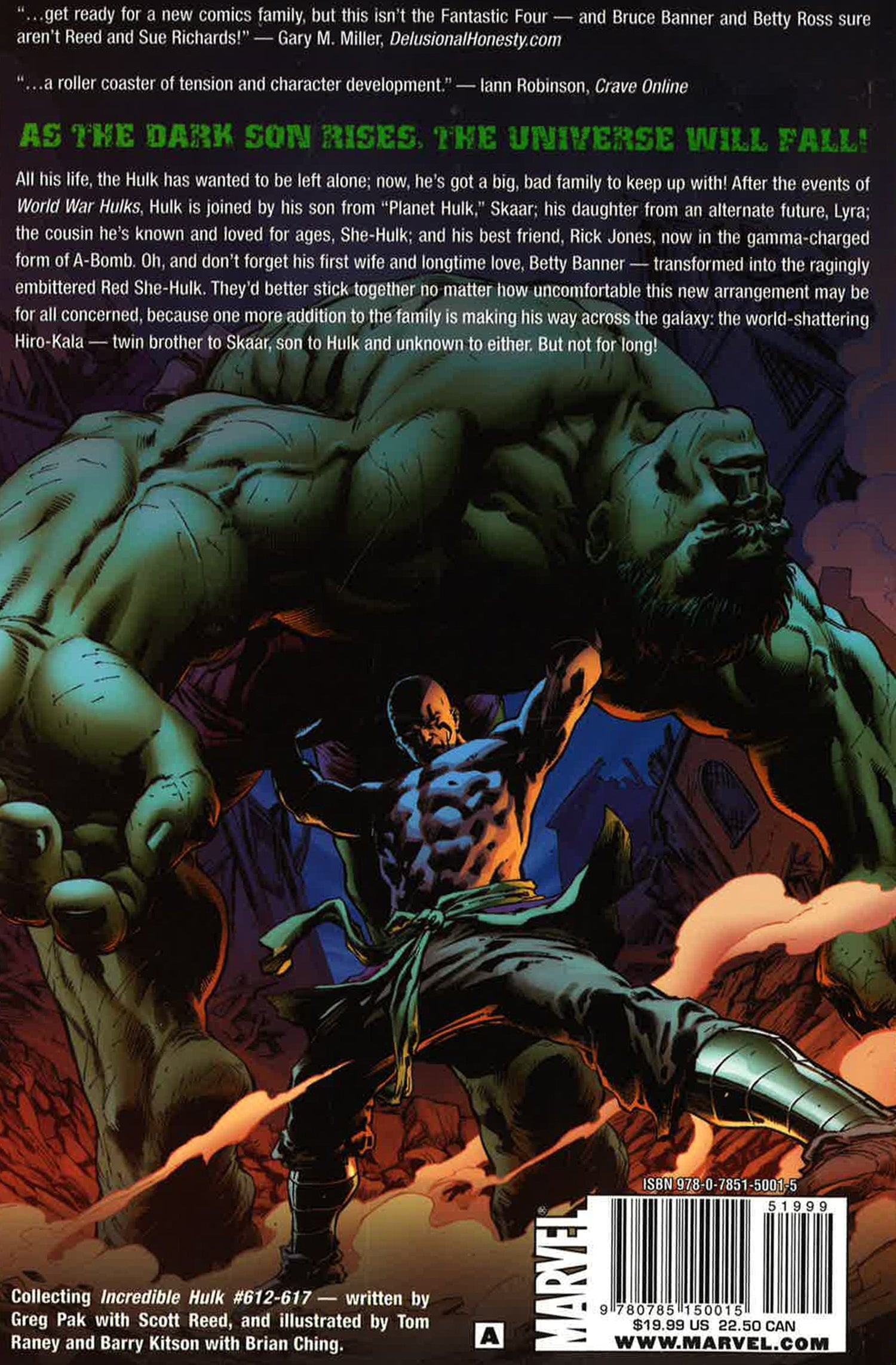 All his life, the Hulk has wanted to be left alone - but now, he's got a big, bad family to keep up with! After the events of WORLD WAR HULKS, Hulk is joined by his son from "Planet Hulk," Skaar; his daughter from an alternate future, Lyra; the cousin he's known and loved for ages, She-Hulk; and his best friend, Rick Jones, now in the gamma-charged form of A-Bomb. Oh, and don't forget his first wife and longtime love, Betty Banner - transformed into the ragingly embittered Red She-Hulk. They'd better stick together no matter how uncomfortable this new arrangement may be for all concerned, because one more addition to the family is making his way across the galaxy: the world-shattering Hiro-Kala - twin brother to Skaar, son to Hulk and unknown to either. But not for long! Collecting INCREDIBLE HULKS #612-617.