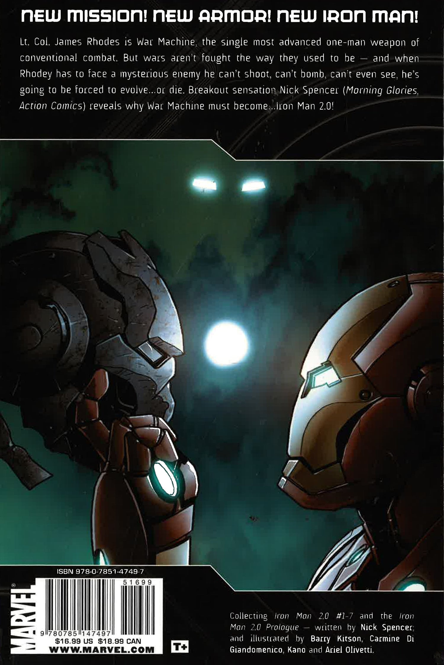 New mission! New armor! New Iron Man! Lt. Col. James Rhodes is War Machine, the single most advanced one-man weapon of conventional combat. But wars aren't fought the way they used to be - and when Rhodey has to face a mysterious enemy he can't shoot, can't bomb, can't even see, he's going to be forced to evolve...or die. Breakout sensation Nick Spencer (Morning Glories, Action Comics) and the legendary Barry Kitson reveal why War Machine must become...Iron Man 2.0!