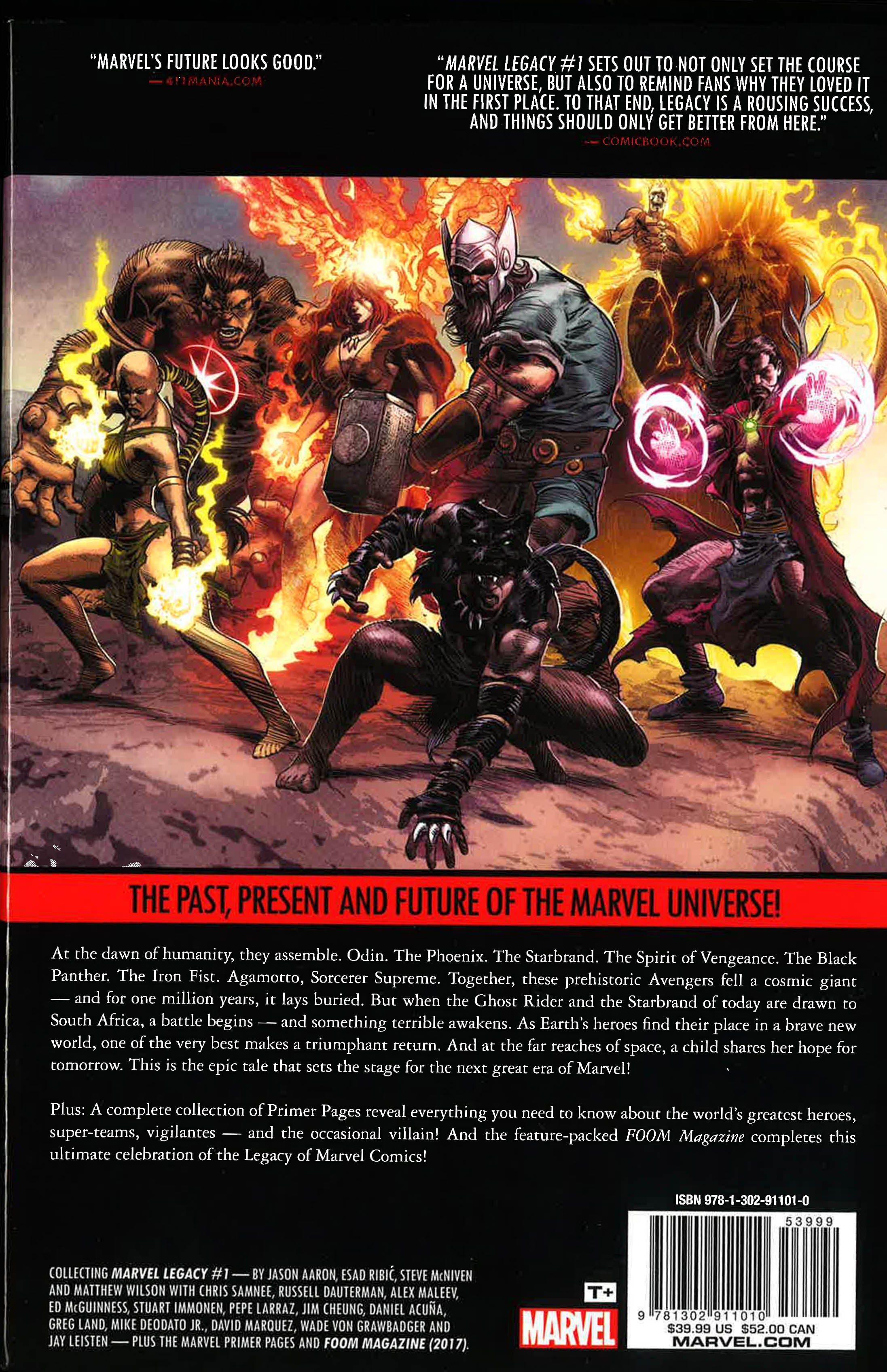 EVERYTHING STARTS HERE! It begins at the dawn of the human race, and ends with a child's prayer! In between, empires fall, mysteries brew, secrets are revealed, quests are undertaken and legends are forged! All leading up to the dramatic return you've been waiting for - and one you've been dreading! Jason Aaron (MIGHTY THOR) and Esad Ribic (SECRET WARS) usher in a new dawn - one whose rays will touch every corner of the Marvel Universe in the days to come! MARVEL LEGACY: It's everything you've been longing for - and more! COLLECTING: MARVEL LEGACY 1, MARVEL PRIMER PAGES