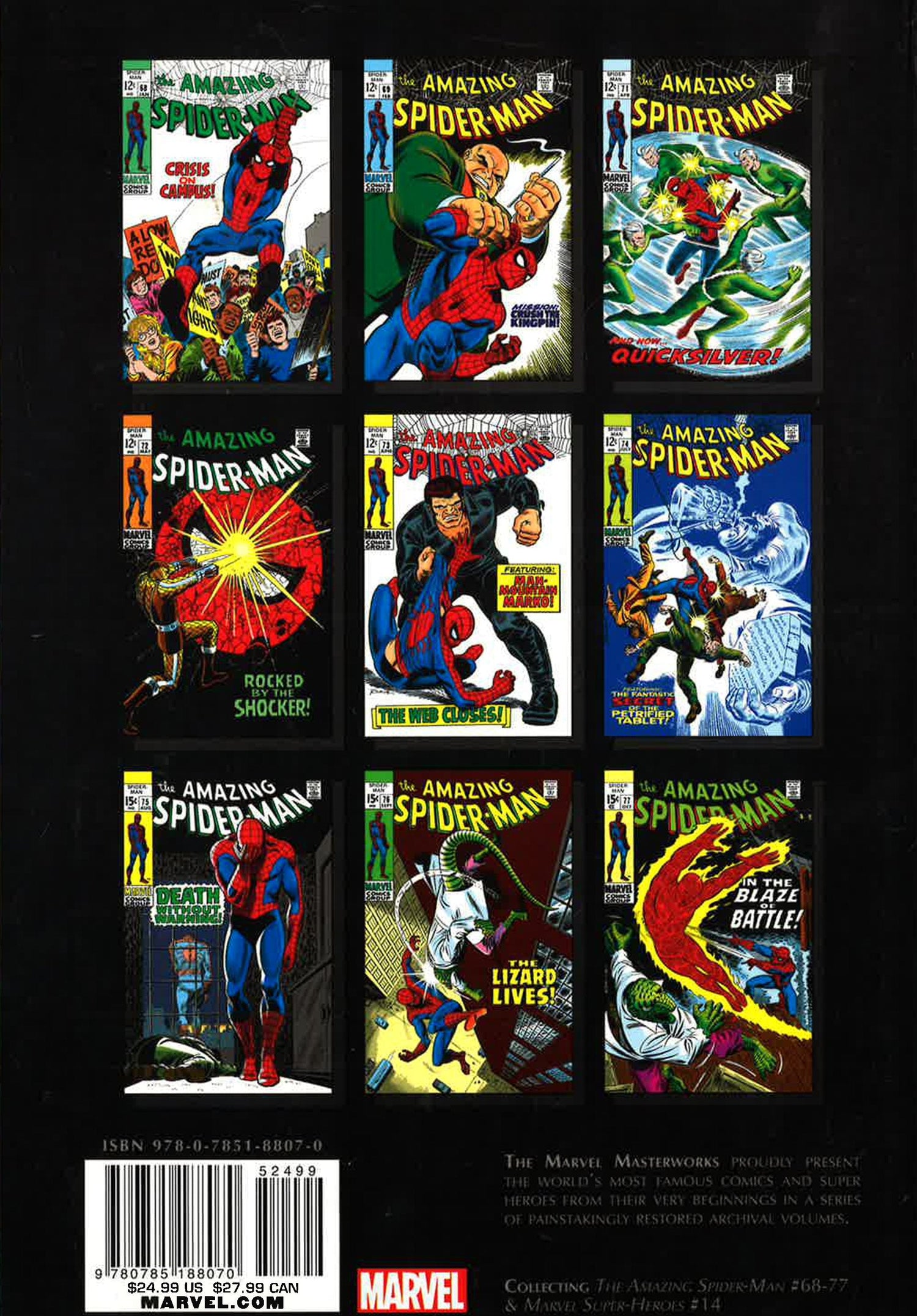 It's time for another round of web-slinging wonderment from two of the men who put the "master" in Masterworks - Stan Lee and John Romita Sr.! Their classic "Saga of the Stone Tablet" kicks off with the Kingpin's quest to decipher an ancient clay tablet whose secrets promise great power. But Spidey soon gets caught in the mix and finds himself branded Public Enemy Number 1! With the Kingpin on one side and J. Jonah Jameson on the other, turning up the heat in the Daily Bugle, things go from bad to horrible when the mob gets involved. It's a Peter Parker pressure cooker! COLLECTING AMAZING SPIDER-MAN (1963) 68-77, MARVEL SUPER-HEROES (1967) 14 *This book may have remainder mark*