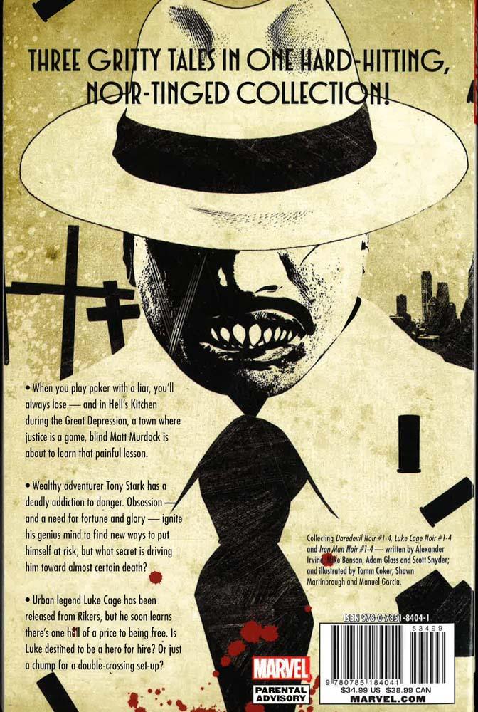 The Marvel Universe - shot in noir! When you play poker with a liar, you'll always lose...and in Hell's Kitchen during the Great Depression, a town where justice is a game, blind Matt Murdock is about to learn that painful lesson. Plus: wealthy adventurer Tony Stark has a deadly addiction to danger. Obsession and a need for fortune and glory ignite his genius mind to find new ways to put himself at risk...but what secret is driving him toward almost certain death? Then: urban legend Luke Cage has been released from Ryker's...but he soon finds out there's one hell of a price to being free. I s Luke destined to be a hero for hire? Or just a chump for a double-crossing set-up? COLLECTING: Daredevil Noir 1-4, Luke Cage Noir 1-4, Iron Man Noir 1-4