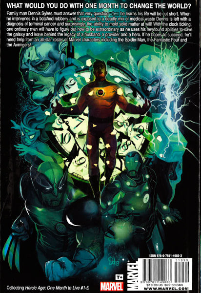 An all-star creative roster brings you an all-new Marvel event! In a world of unlikely heroes, Dennis Sykes is about to become the unlikeliest. He's a banker by day, struggling parent by night but when a tragic turn of events gives Dennis a 30 day death sentence, he discovers his accident comes with super-powers. And as the weeks in Dennis' life tick down, he sets out to leave a mark one way or the other even if he has to go through Spider-Man, the Fantastic Four and the Avengers to do it.Collecting: Heroic Age: One Month to Live #1-5