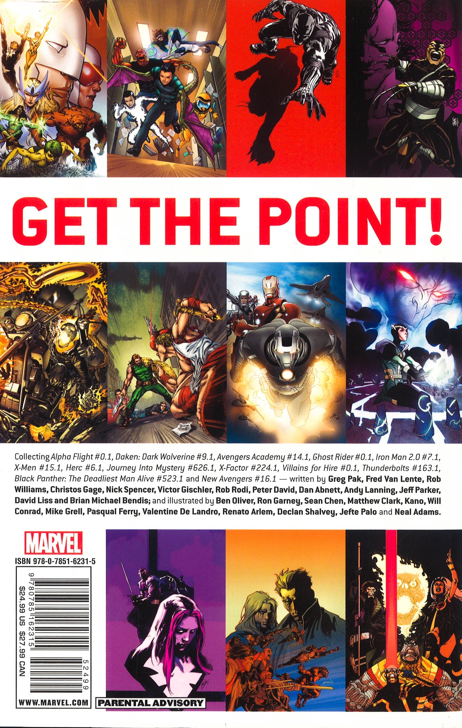 START READING with these Point One issues! The House of Ideas proudly presents its second exciting collection of one-shots that bring the history of its greatest heroes into the modern era. Alpha Flight returns! Daken settles the score with Wolverine! The Avengers Academy meets the program washouts! Who will be the new Ghost Rider? War Machine is rebooted as Iron Man 2.0! The X-Men battle a demonic horde! Herc is hunted by a figure from his past! Young Loki learns about his past!