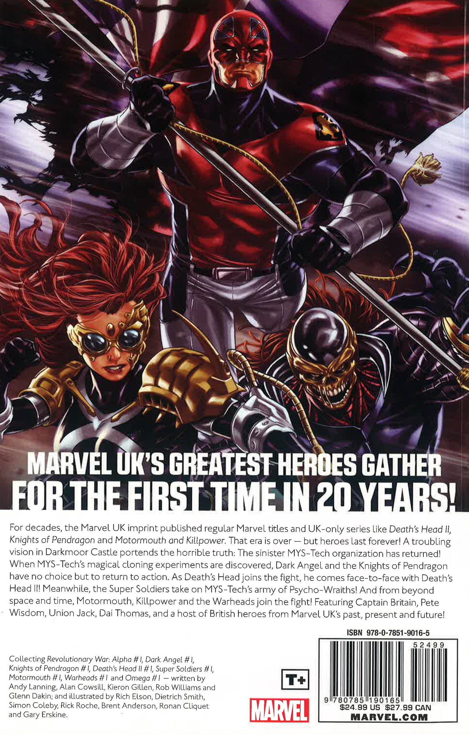Marvel UK's greatest heroes come together for the first time in 20 years to face a threat that could destroy the world! A troubling vision in Darkmoor Castle portends the horrible truth: the sinister MyS-Tech organization has returned! When their magical cloning experiments are discovered, Dark Angel and the Knights of Pendragon have no choice but to return to action! Death's Head comes face to face with Death's Head II as they rally against MyS-Tech across time! The Supersoldiers take on MyS-Tech's army of Psycho Wraiths! And from beyond space and time, Motormouth, Killpower and the Warheads join the fight! Featuring Captain Britain, Pete Wisdom, Union Jack, Dai Thomas and a host of British heroes from Marvel UK's past, present and future! Collecting: Revolutionary War: Alpha 1, Revolutionary War: Dark Angel 1, Revolutionary War: Knight s Of Pendragon 1, Revolutionary War: Death's Head II 1, Revolutionary War: Supersoldiers 1, Revolutionary War: Motor-mouth 1, Revolutionary War: Warheads 1, Revolutionary War: Omega 1 *This book may have remainder mark*