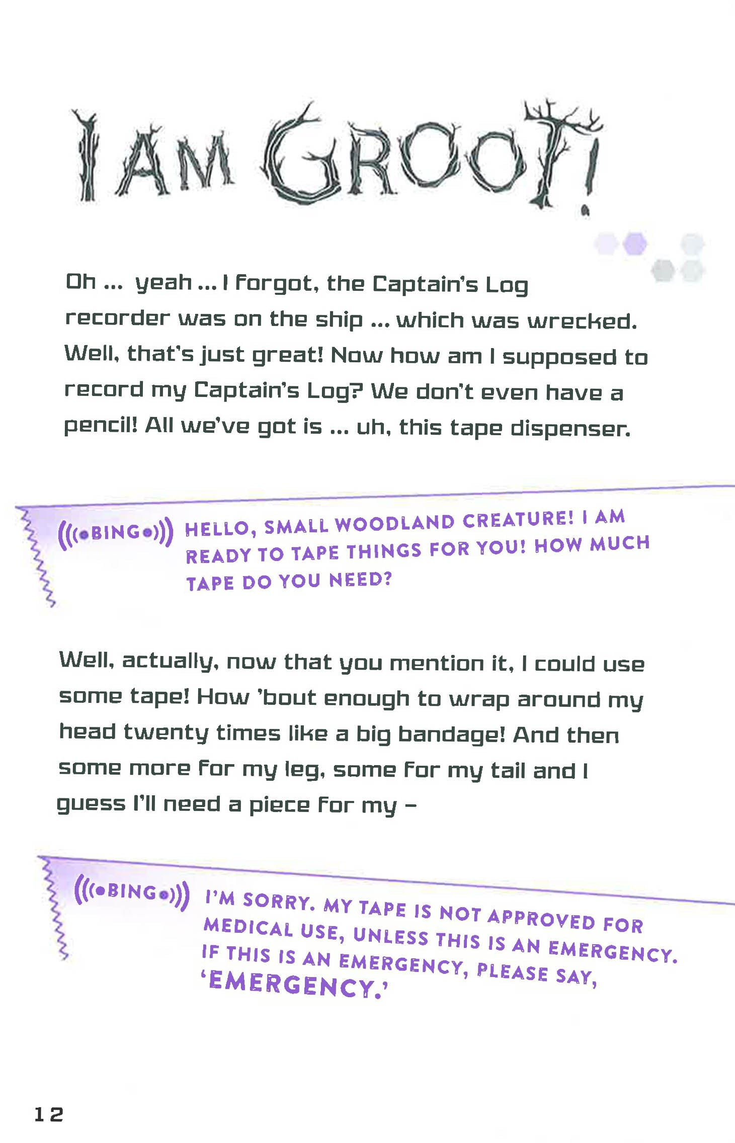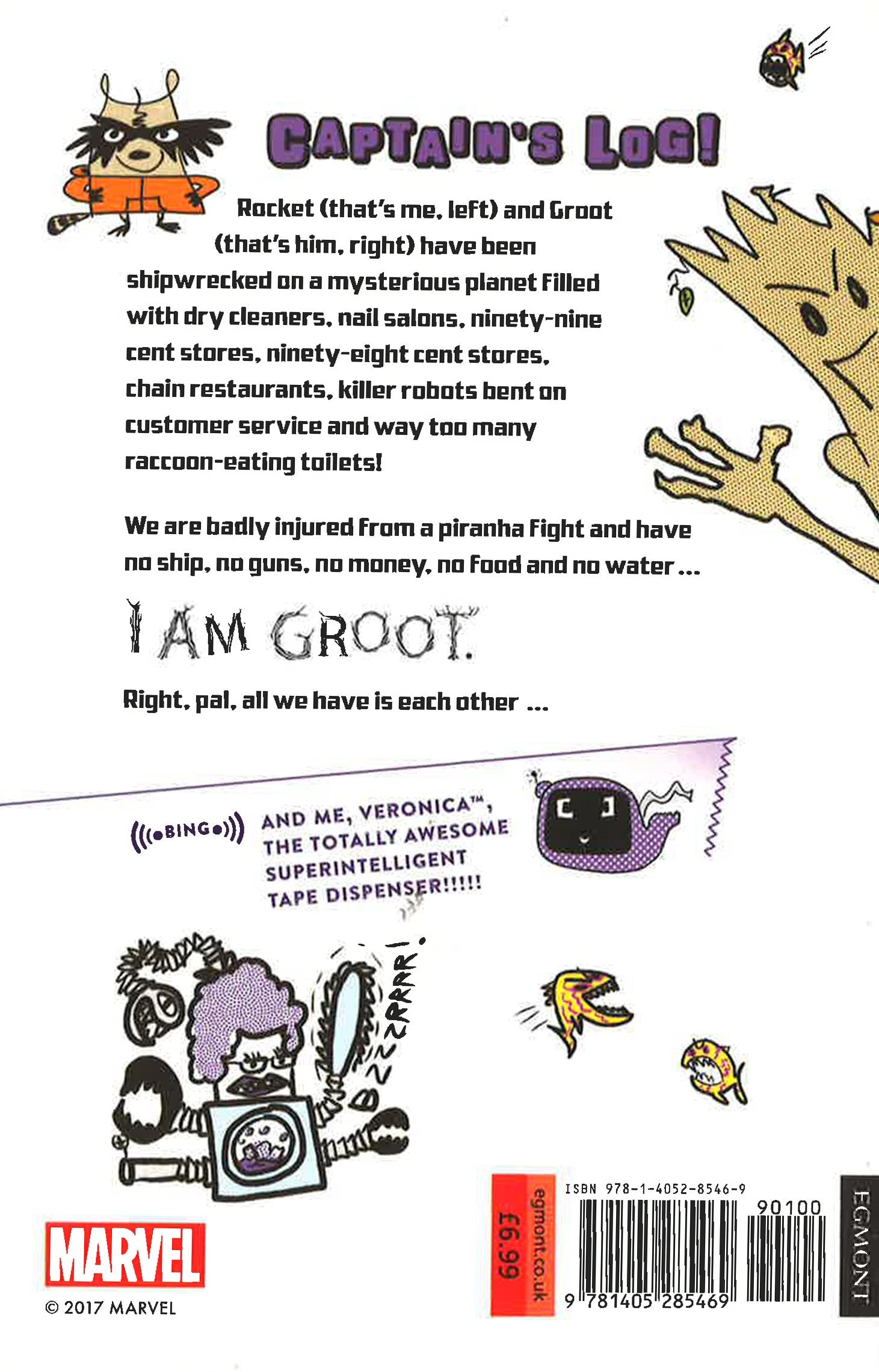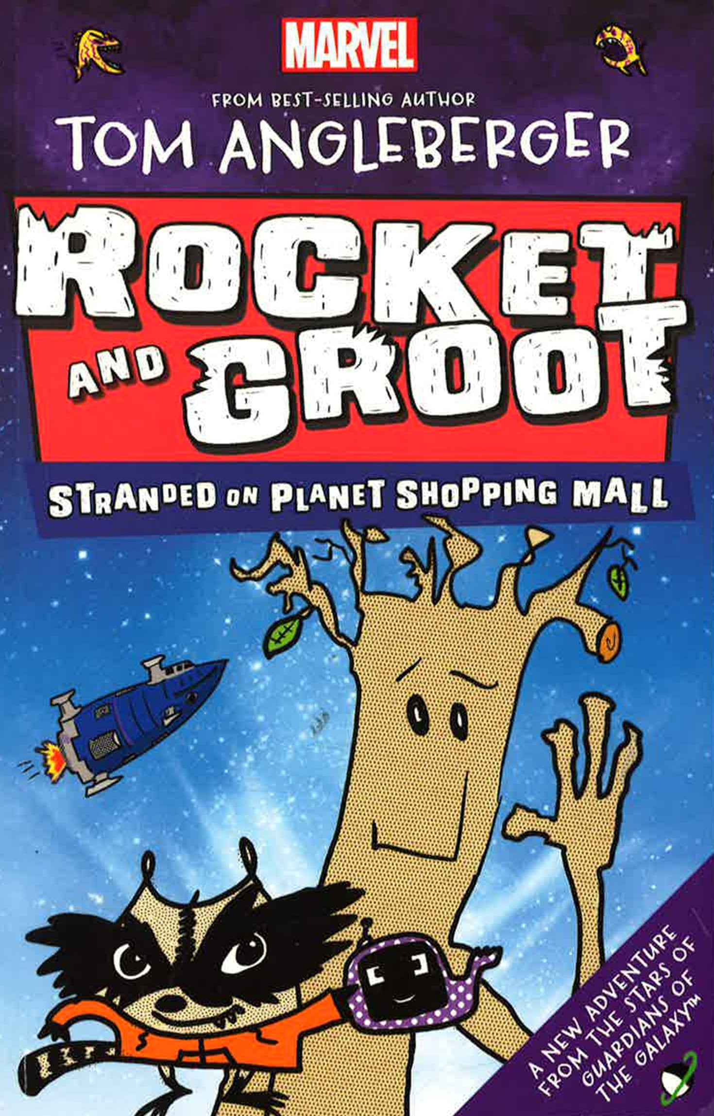 An original fiction title starring Rocket and Groot from the highly popular Guardians of the Galaxy film. This middle grade novel, perfect for 8-12 year olds, follows Rocket Raccoon and his walking, talking tree buddy Groot, as they crash-land on a mysterious planet made up of 99 cent stores, nail salons and low-end chain restaurants ... basically it's a planet made entirely of shopping malls! There are also robot employees bent on destruction, toilets that want to eat anyone that comes near them, flying teeth, killer yo-yos, and Veronica: a highly intelligent tape dispenser that has the skills of a ninja. This is first in a series of original Rocket and Groot novels written and illustrated by Tom Angleberger, creator of the Origami Yoda series. Look out for Marvel Rocket and Groot: Keep on Truckin'!