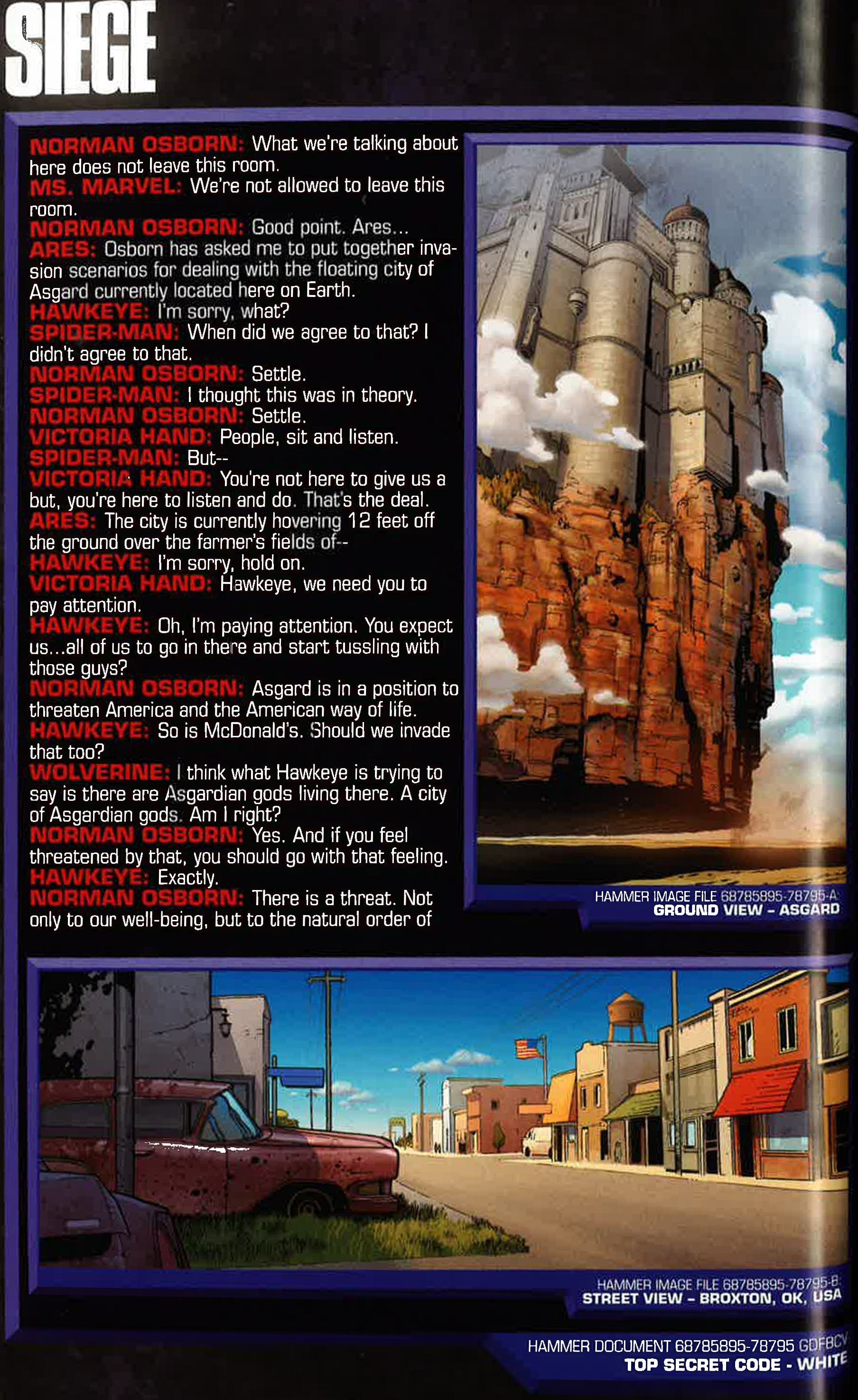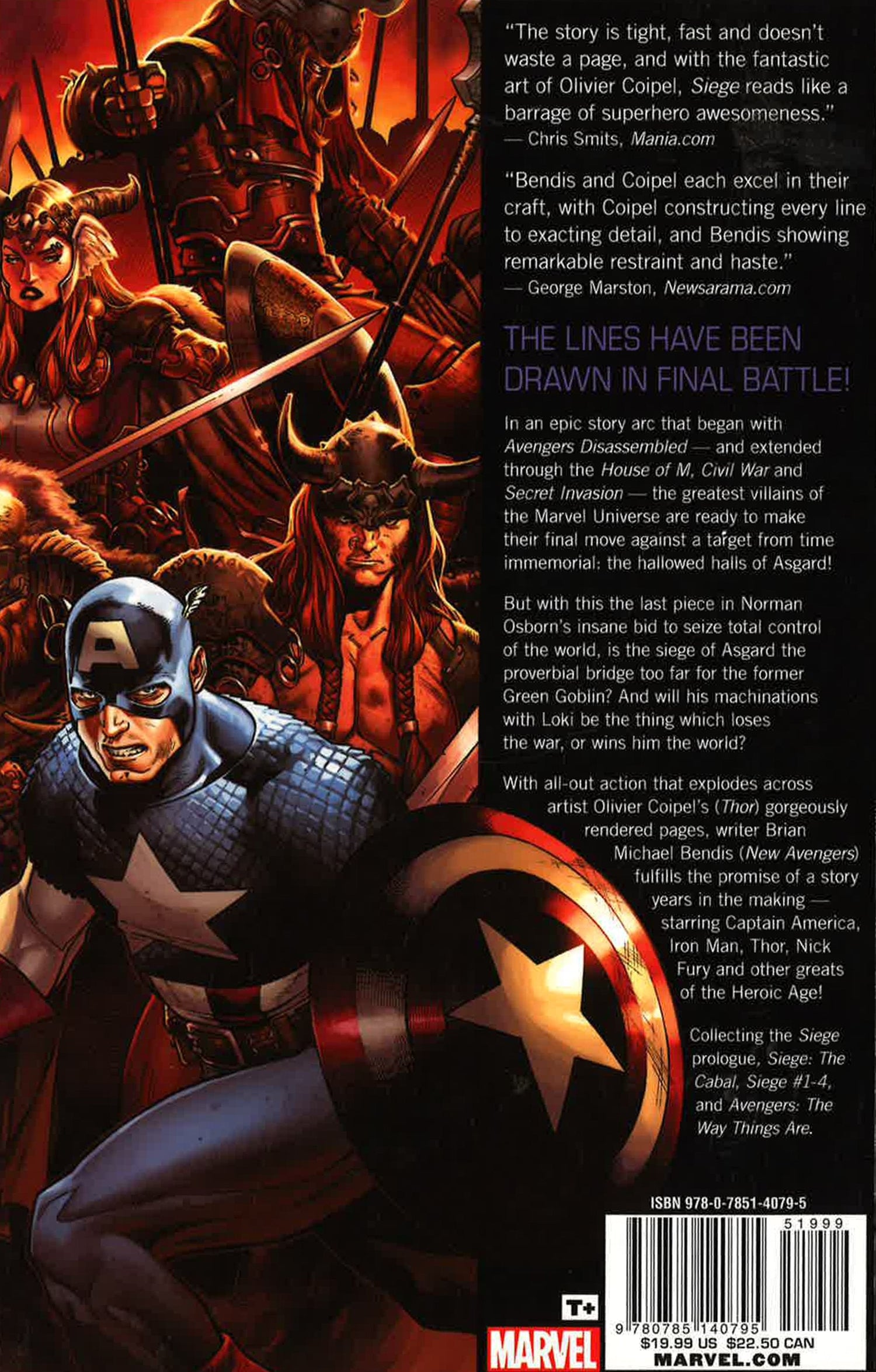 Beginning with the ravaging effects of Avengers Disassembled and following the aftermath of House of M, Civil War and Secret Invasion, culminating with the evil Reign of Norman Osborn, the Marvel Universe has been left with its greatest villains holding more power and control than ever before. On the brink of madness, Osborn, in his final bid to take total control, targets the final obstacle in his mission...Asgard. Events are set in motion forcing our heroes to put aside the deep rifts that have grown over the past seven years. Opposing them stand a horde of evil that has begun to take down the gods of the Golden Realm! SIEGE will rock the foundations of every super hero, villain and team in the Marvel Universe. As an era ends, one word will ring above all others..."SIEGE.