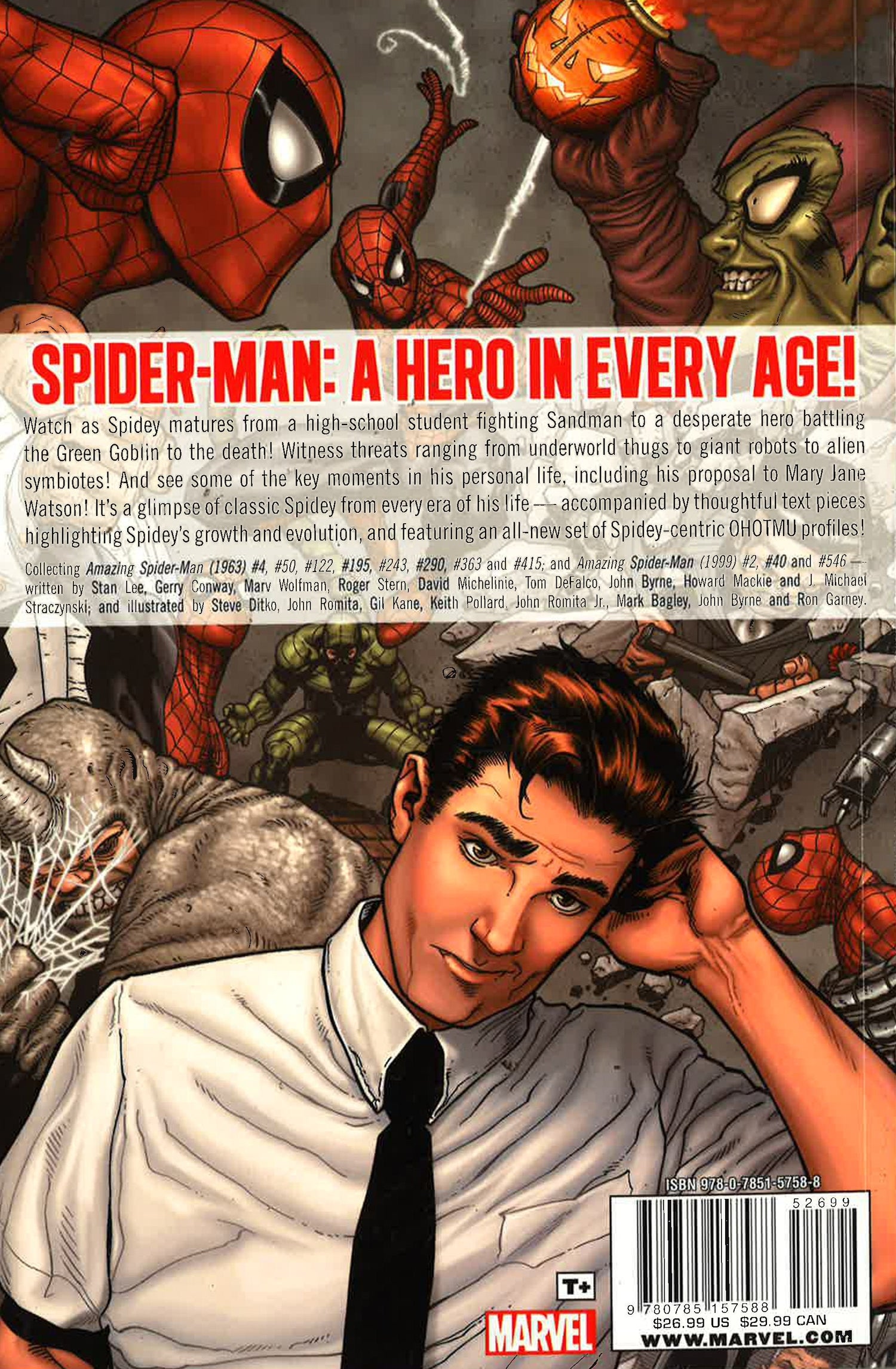 Spider-Man: a hero in every age! Watch as Spidey matures from a high-school student fighting Sandman to a desperate hero battling the Green Goblin to the death! Witness threats ranging from underworld thugs to giant robots to alien symbiotes! And see some of the key moments in his personal life, including his proposal to Mary Jane Watson! It's a glimpse of classic Spidey from every era of his life - accompanied by thoughtful text pieces highlighting Spidey's growth and evolution, and featuring an all-new set of Spidey-centric OHOTMU profiles! Collecting AMAZING SPIDER-MAN (1963) #4, #50, #122, #195, #243, #290, #363 and #415; and AMAZING SPIDER-MAN (1999) #2, #40 and #546.