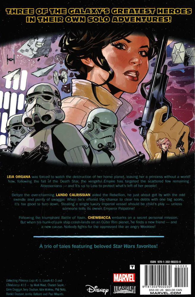 Three of the most beloved characters in the entire Star Wars saga, in their own solo adventures! After Star Wars: Episode IV A New Hope, Leia Organa is a princess without a world! But she still feels a duty to her people. Can she save the remaining Alderaanians from the might of the Galactic Empire? Before master of charm Lando Calrissian joined the rebellion, or even ran Cloud City, he and faithful ally Lobot got by with the odd swindle and plenty of swagger. But this time, has Lando bitten off more than he can chew? Speaking of things getting Chewy, everybody's favorite Wookiee warrior also faces some alone time after the battle of Yavin. Stranded on an Imperial occupied planet, far away from Han Solo, will he make a new best friend?