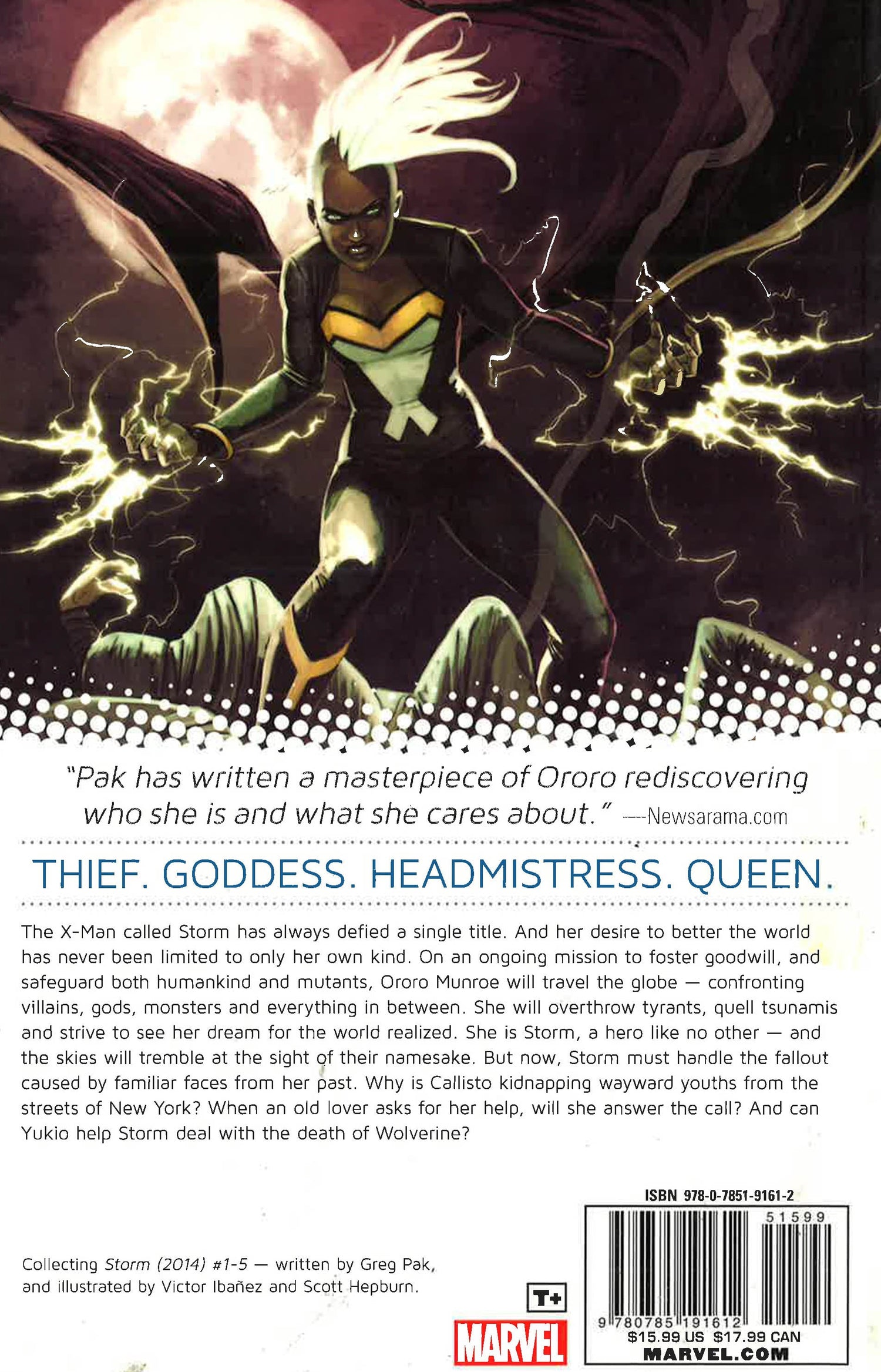Thief. Goddess. Headmistress. Queen. The X-Man called Storm has always defied a single ti tle. And her desire to better the world has never been limited to only her own kind. On an ongoing mission to foster goodwill and safeguard both mankind and mutants, Ororo Munroe will travel the globe, confronting villains, gods, monsters and everything in between. She will overthrow tyrants, quell tsunamis and strive to see her dream for the world realized. She is Storm, a hero like no other...and the skies will tremble at the sight of their namesake. But now, Storm must handle the fallout caused by familiar faces from her past. Why is Callisto kidnapping wayward youth from the streets of New York? Will Storm's romance with Forge be reignited? And can Yukio help Storm deal with the recent death of Wolverine? *This book may have remainder mark*
