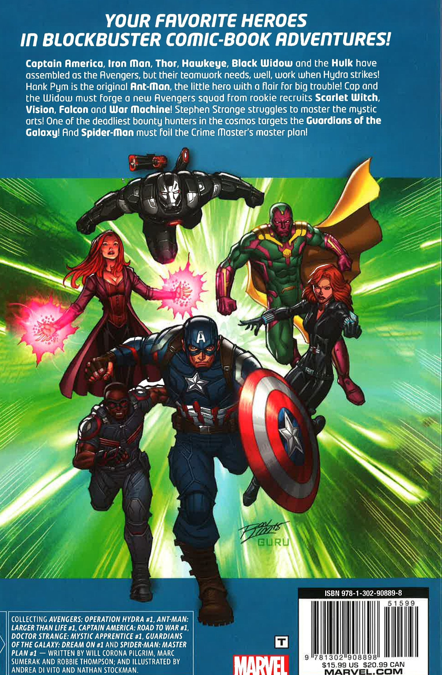 Your favorite heroes from the movies, in blockbuster comic-book adventures! Captain America, Iron Man, Thor, Hawkeye, Black Widow and the Hulk have assembled as the Avengers, but their teamwork needs, well, work when Hydra strikes! Hank Pym is the original Ant-Man, the little hero with a flair for big trouble! Cap and the Widow must forge a new Avengers squad from fresh recruits Scarlet Witch, Vision, Falcon and War Machine! Stephen Strange struggles to master the mystic arts! And the Guardians of the Galaxy are targeted by one of the deadliest bounty hunters in the cosmos - Death's Head! All that, and Spider-Man too! COLLECTING: AVENGERS: OPERATION HYDRA 1, ANT-MAN: LARGER THAN LIFE 1, CAPTAIN AMERICA: ROAD TO WAR 1, DOCTOR STRANGE: MYSTIC APPRENTICE 1, GUARDIANS OF THE GALAXY: DREAM ON 1, SPIDER-MAN: MASTER PLAN 1