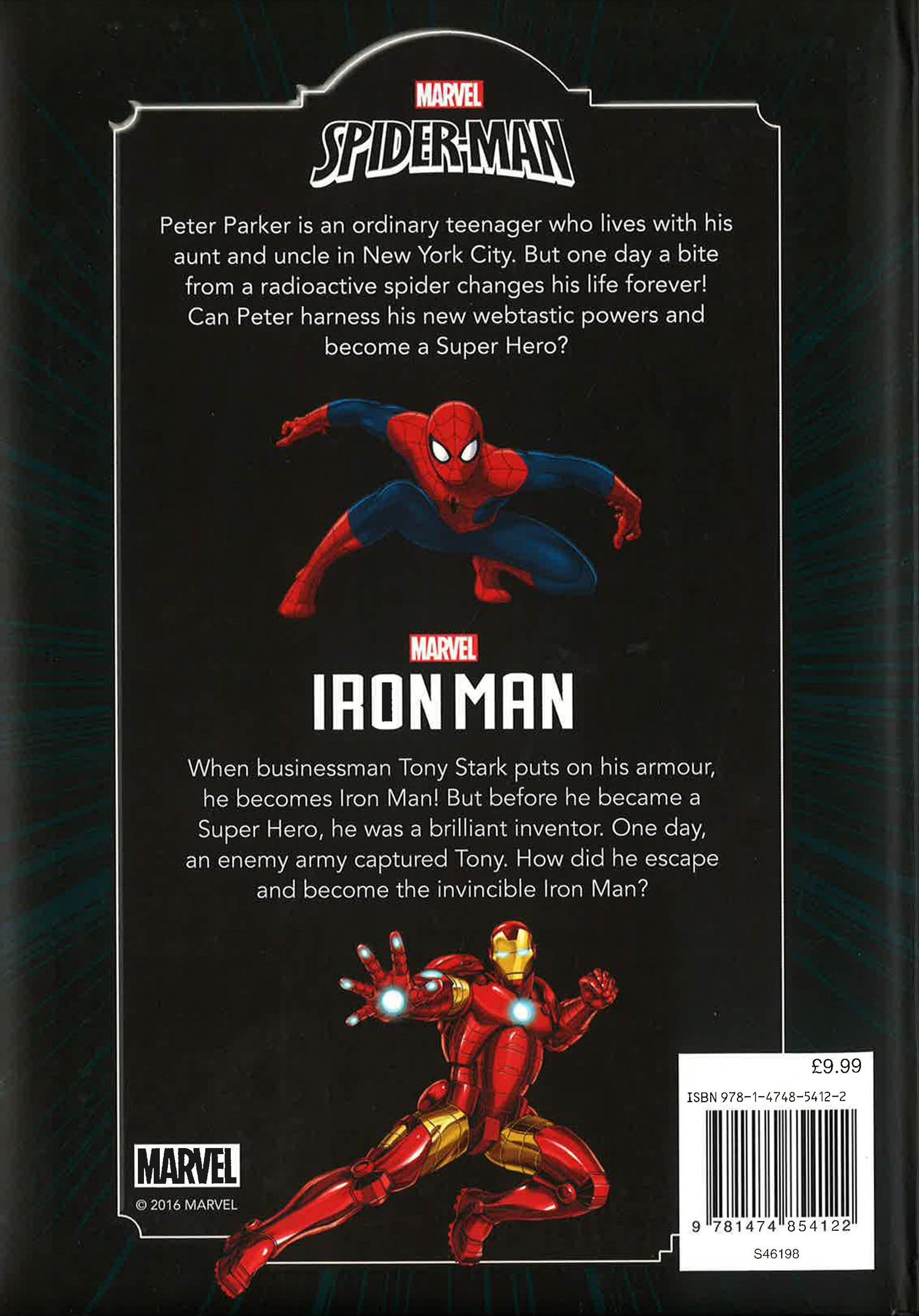 A Marvel storybook featuring two origin stories: Spider-Man and Iron Man. One day, ordinary teenager Peter Parker is bitten by a radioactive spider and his life was never the same again. Can he use his powers for good and become a Super Hero? Businessman Tony Stark was captured by an enemy army. How did he escape and become the invincible Iron Man?