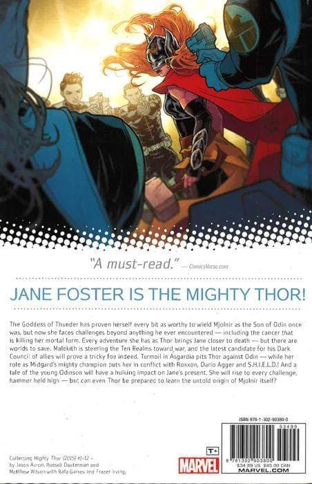 When Dr. Jane Foster lifts the mystic hammer Mjolnir, she is transformed into the Goddess of Thunder, the Mighty Thor! Her enemies are many - including Loki, Malekith and Roxxon - as Asgard descends further into chaos and unrest threatens to spread throughout the Ten Realms. Yet her greatest battle is against a far more personal foe: the cancer that is killing her mortal form. And as Asgard is torn apart from without and within, prepare for a Thor vs. Odin battle like none you've ever seen! Plus, a tale from the past of the young Thor Odinson has hulking great implications in the present! Jane Foster is targeted by S.H.I.E.L.D.! Millions of lives may depend on Thor saving Roxxon's evil executive, Dario Agger! And, most staggeringly of all, discover the secret origin of Mjolnir! COLLECTING: MIGHTY THOR (2015) 1-12