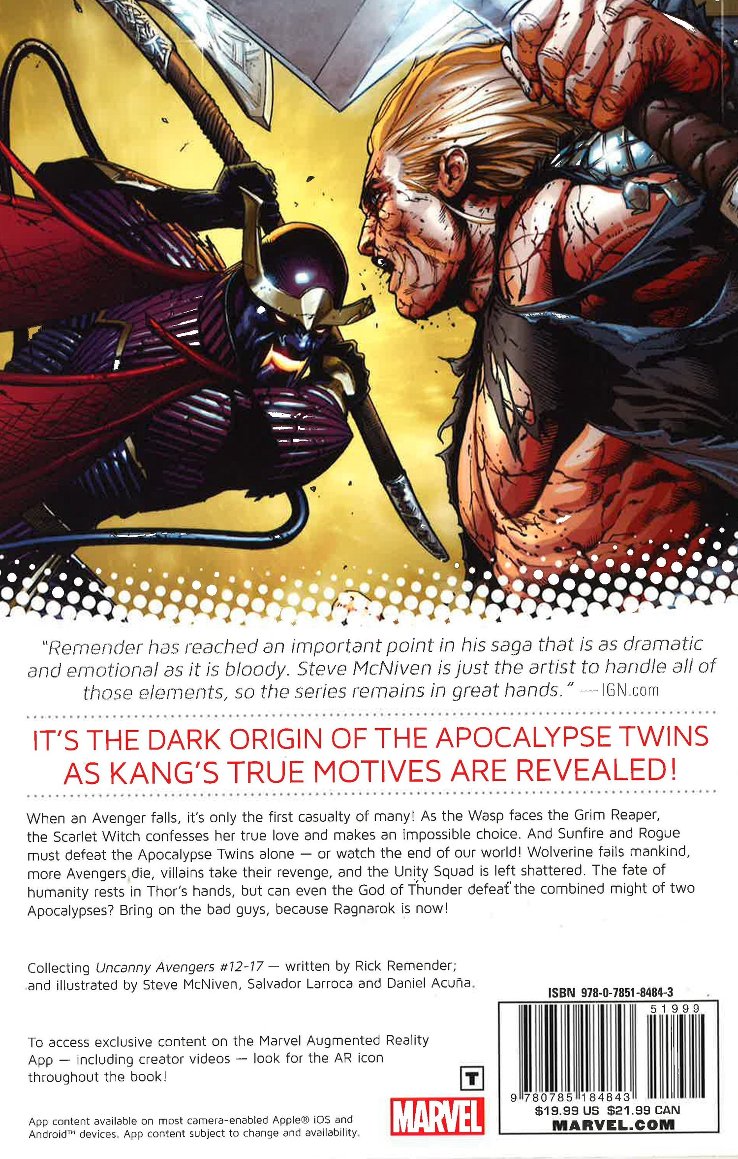 It's the dark origin of the Apocalypse Twins as Kang's true motives are revealed! When an Avenger falls, it's only the first casualty of many! As the Wasp faces the Grim Reaper, the Scarlet Witch confesses her true love and makes an impossible choice. And Sunfire and Rogue must defeat the Apocalypse Twins alone - or watch the end of our world! Wolverine fails mankind, more Avengers die, villains take their revenge, and the Unity Squad is left shatt ered. The fate of humanity rests in Thor's hands, but can even the God of Thunder defeat the combined might of two Apocalypses? Bring on the bad guys, because Ragnarok is now! *This book may have remainder mark*