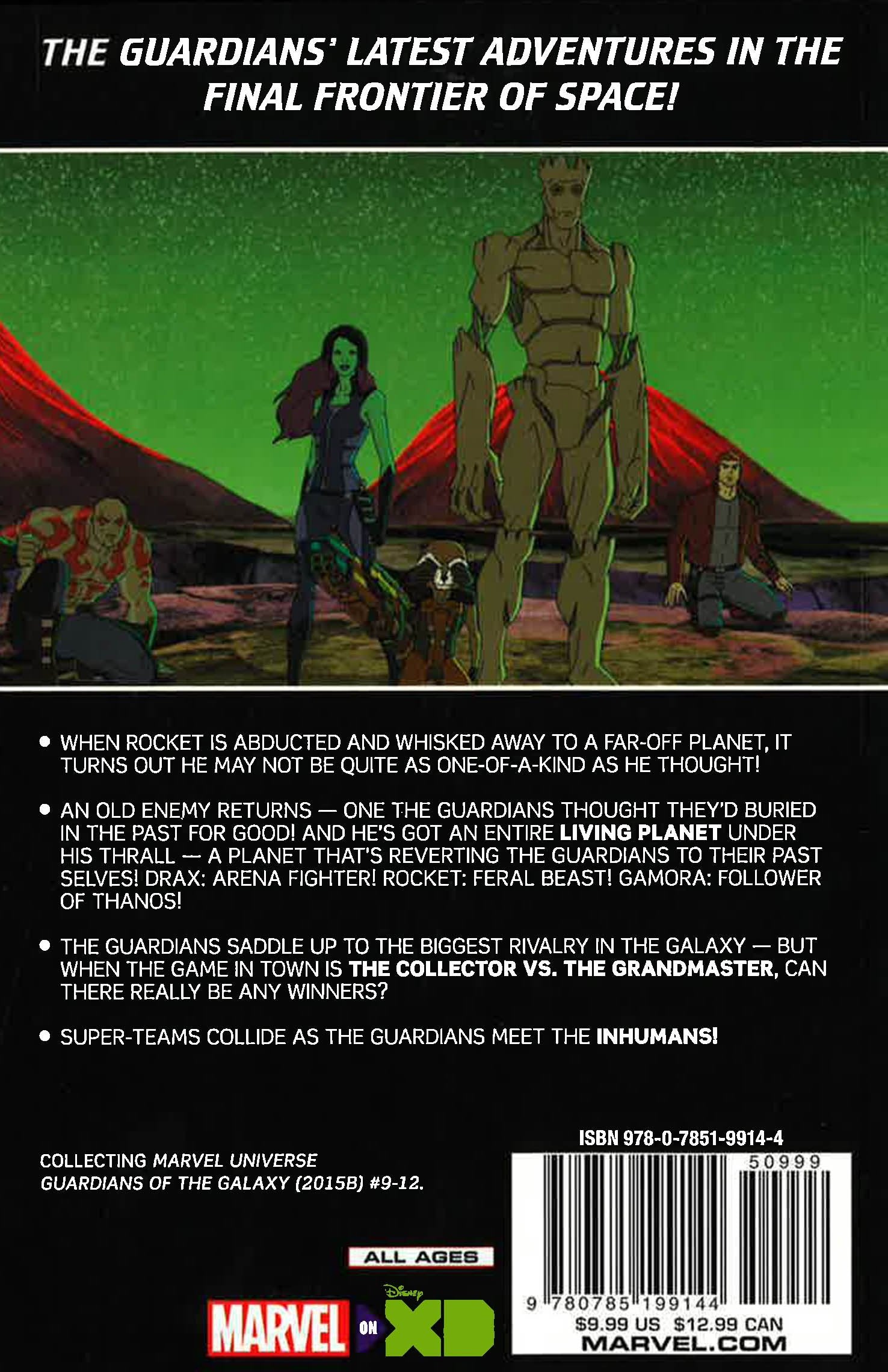Star-Lord! Rocket! Groot! Gamora! Drax! Join your favorite guardians as they continue their adventures across the galaxy! See what happens when Rocket is abducted and whisked away to a far-off planet! And it turns out Rocket may not be quite as one-of-a-kind as he thought...!COLLECTING: MARVEL UNIVERSE GUARDIANS OF THE GALAXY 9-12