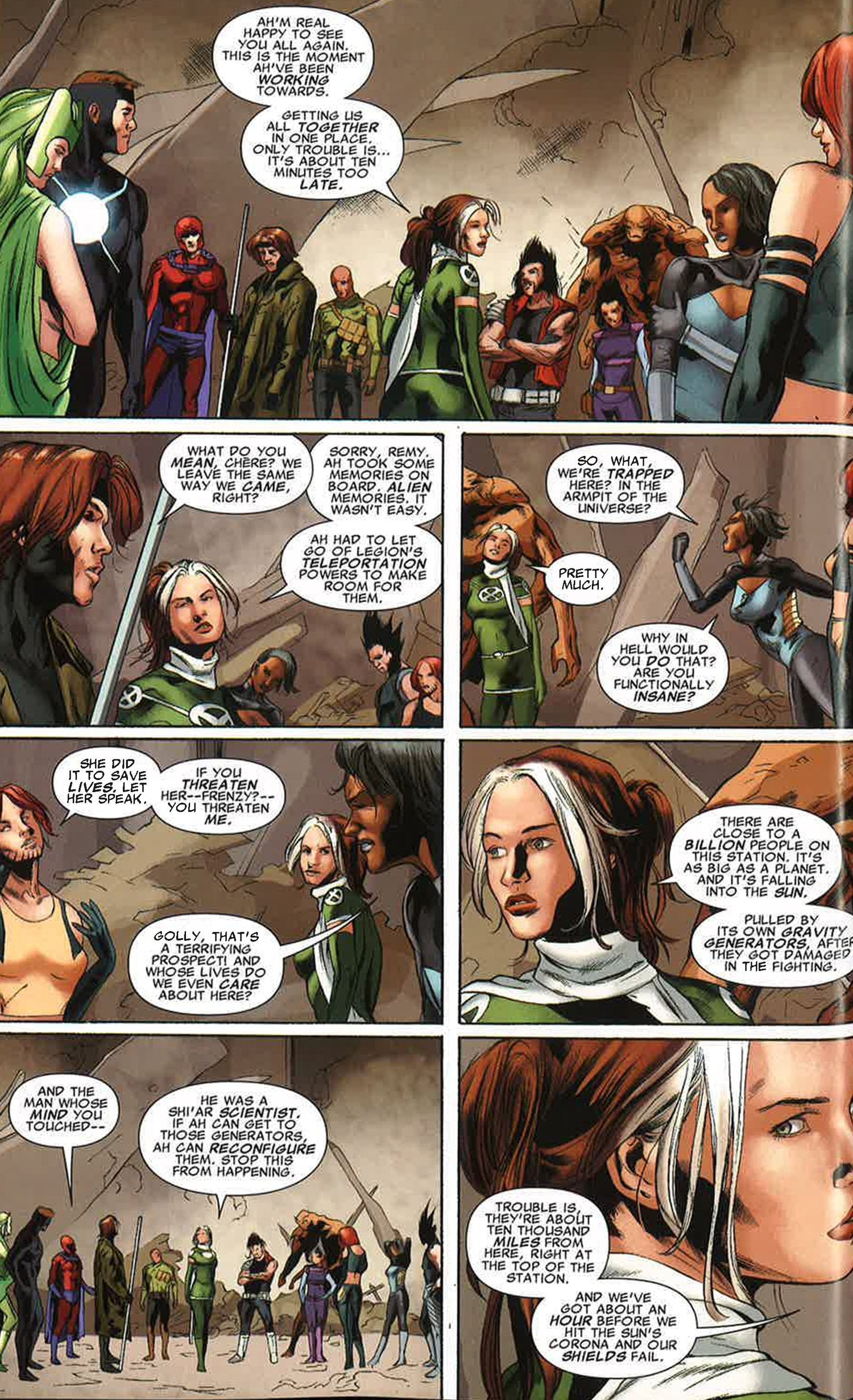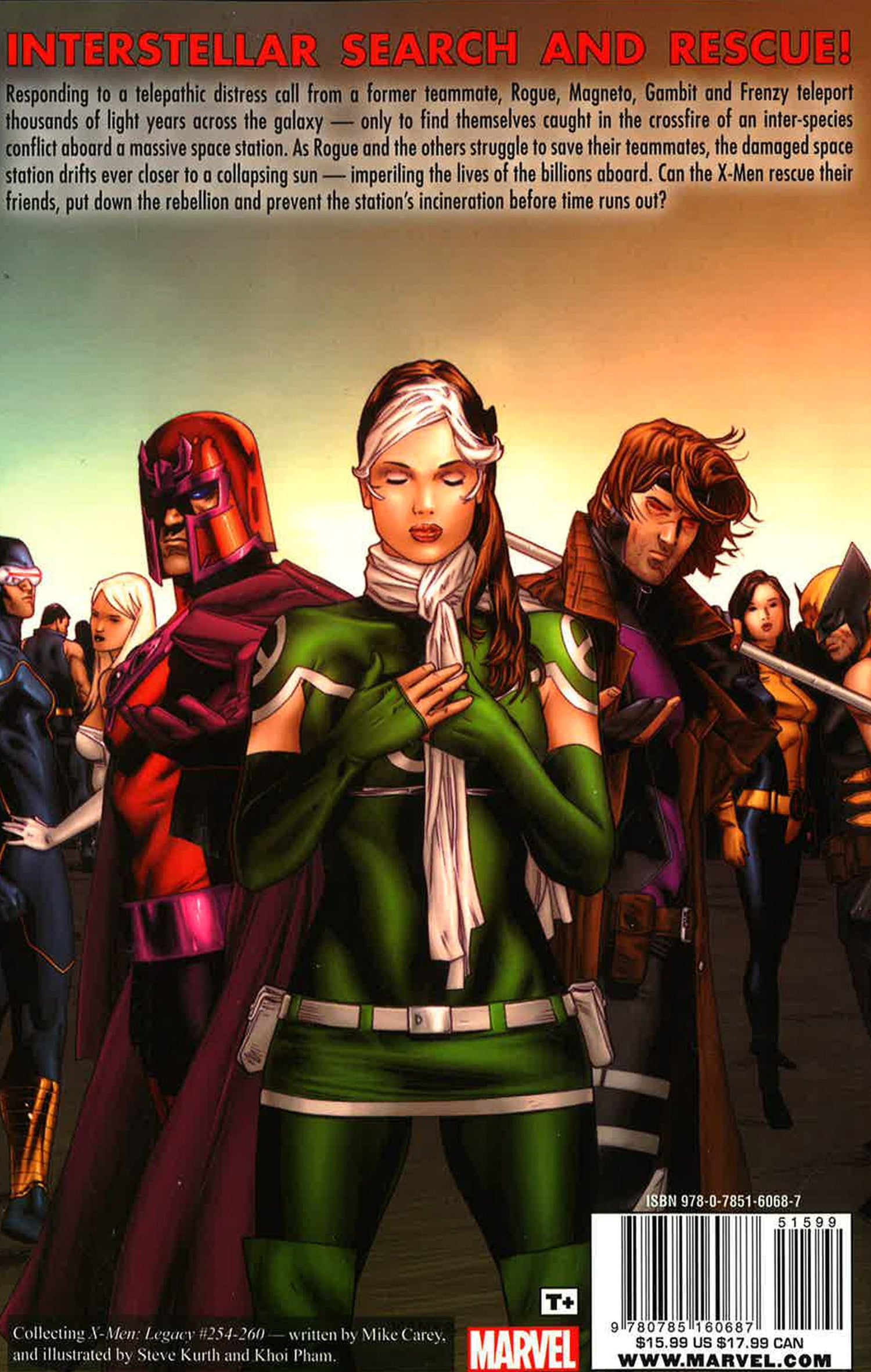 Interstellar search and rescue! Responding to a telepathic distress call from a former teammate, Rogue, Magneto, Gambit and Frenzy teleport thousands of light years across the galaxy - only to find themselves caught in the crossfire of an inter-species conflict aboard a massive space station. As Rogue and the others struggle to save their teammates, the damaged space station drifts ever closer to a collapsing sun - imperiling the lives of the billions aboard. Can the X-Men rescue their friends, put down the rebellion and prevent the station's incineration before time runs out? COLLECTING: X-Men Legacy 254-260