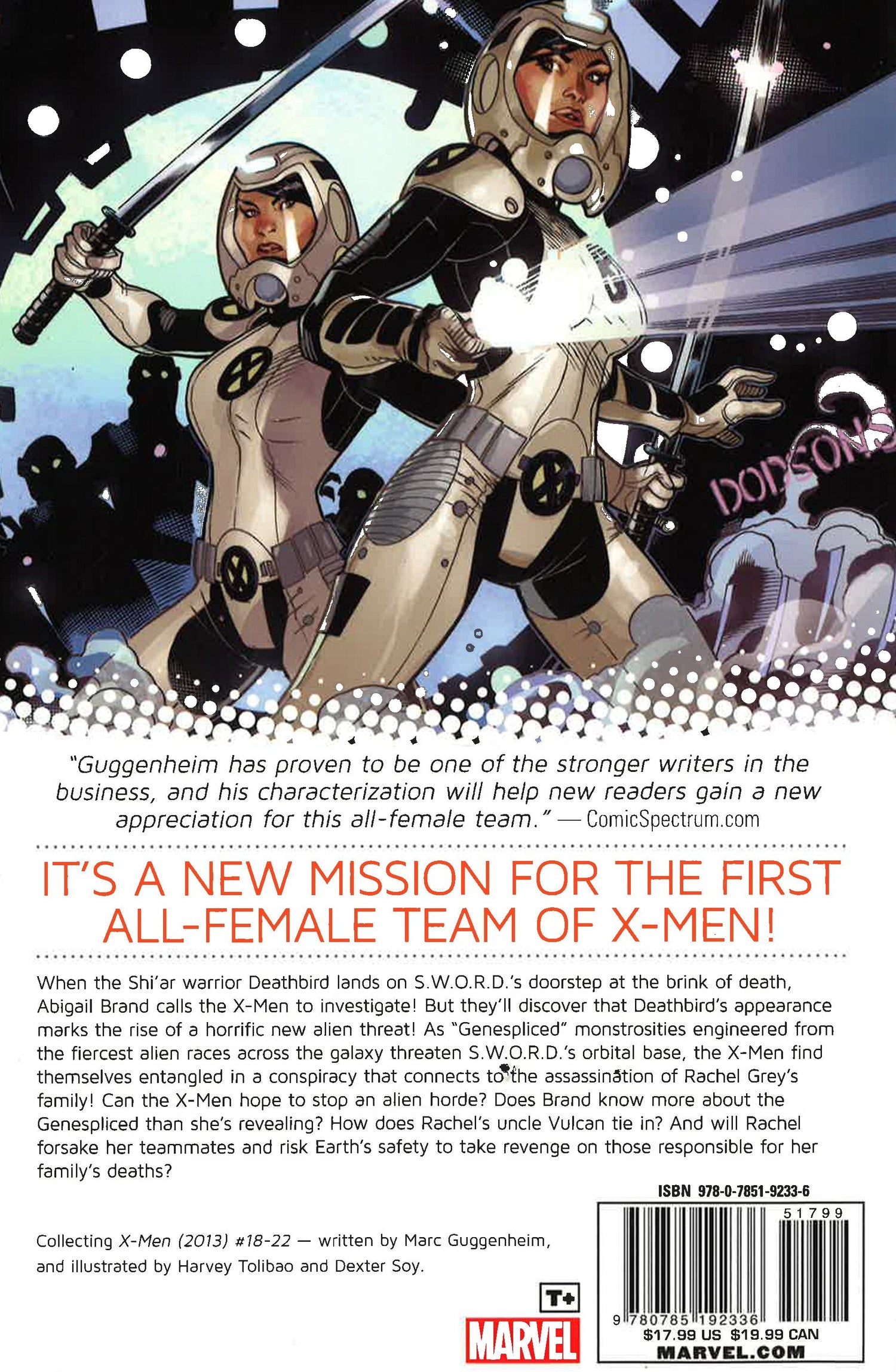 From the executive producer of TV's "Arrow"! It's a new creative team and a new mission for the first all-female team of X-Men! When the ferocious Shi'ar warrior Deathbird lands on S.W.O.R.D.'s doorstep at the brink of death, Abigail Brand calls in the X-Men to investigate! But are even the X-Men equipped to handle the horrific new threat that's emerged from the edge of space? Monstrosities called the "Genespliced" - creatures engineered from the fiercest alien races across the galaxy - threaten S.W.O.R.D.'s orbital base, but as the X-Men explore the Acanti Skunkworks, they soon find themselves entangled in a conspiracy that has connections to the deaths of Rachel Grey's family! Can the X-Men hope to stop an alien horde? And does Brand know more about the Genespliced than she's letting on? *This book may have remainder mark*