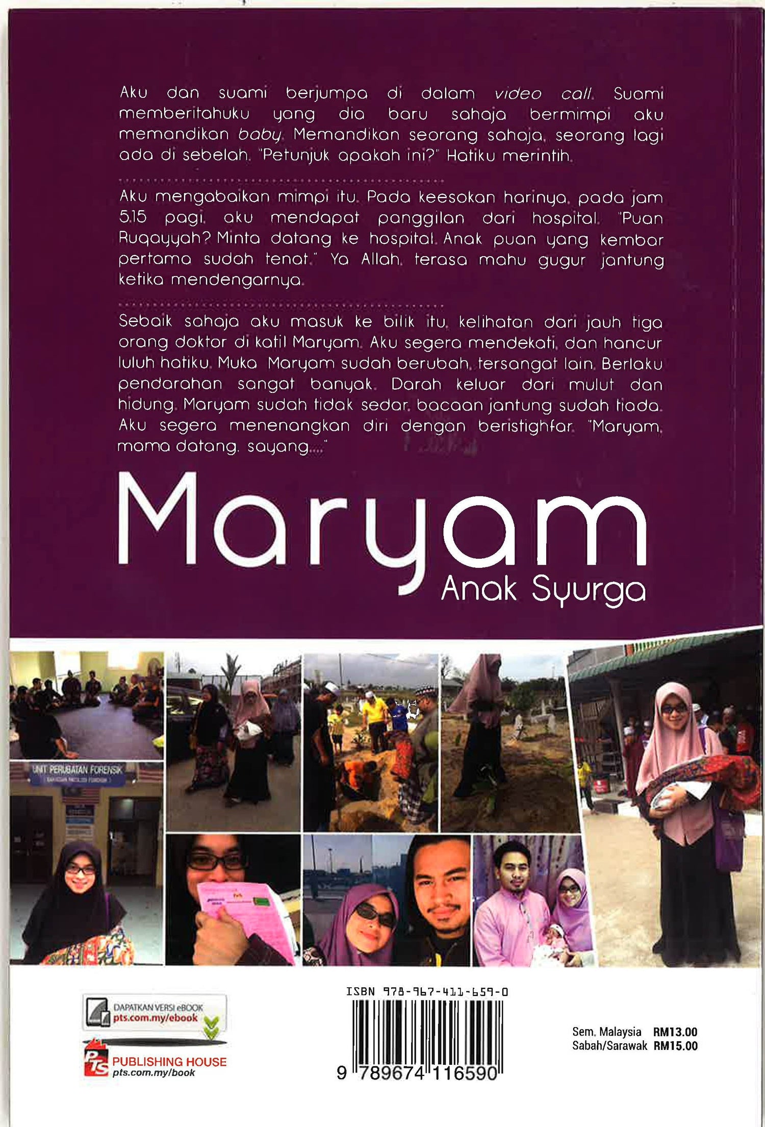 Sebaik sahaja aku masuk ke bilik itu kelihatan dari jauh tiga orang doktor di katil Maryam. Aku segera mendekati. dan hancur luluh hatiku. Muka Maryam sudah berubah, tersangat lain Berlaku pendarahan sangat banyak. Darah keluar dari mulut dan hidung. Maryam sudah tidak sedar, bacaan jantung sudah tiada. Aku segera menenangkan diri dengan beristighfar. "Maryam mama datang, sayang