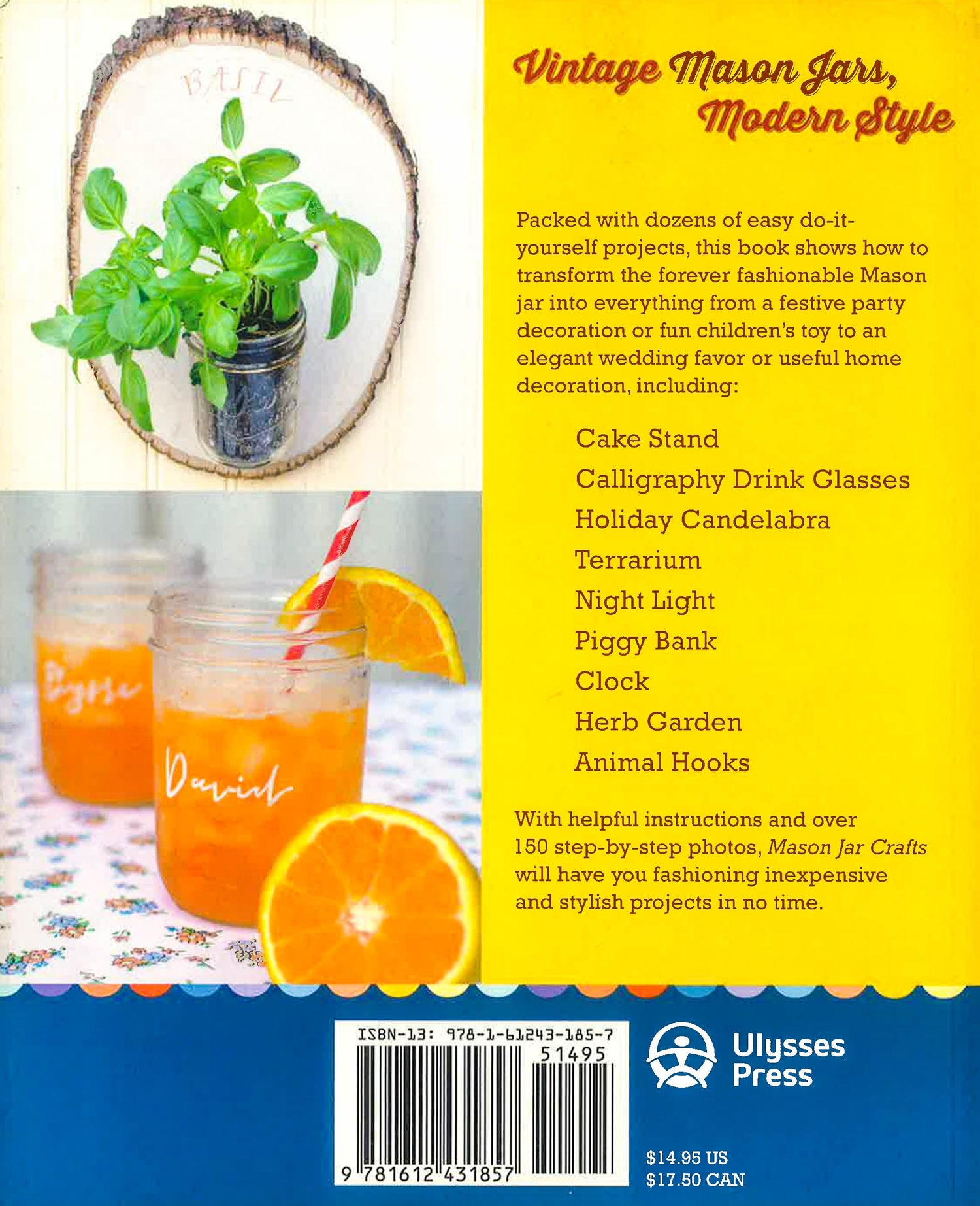 VINTAGE MASON JARS, MODERN STYLE Packed with dozens of easy do-it yourself projects, this book shows how to transform the forever fashionable Mason jar into everything from a festive party decoration or fun children's toy to an elegant wedding favor or useful home decoration, including: * Cake Stand * Calligraphy Drink Glasses * Holiday Candelabra * Terrarium * Night Light * Piggy Bank * Clock * Herb Garden * Animal Hooks With helpful instructions and over 150 step-by-step photos, Mason Jar Crafts will have you fashioning inexpensive and stylish projects in no time.