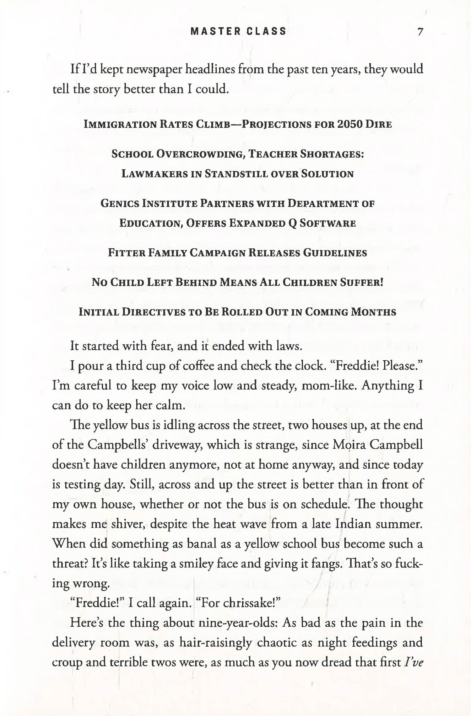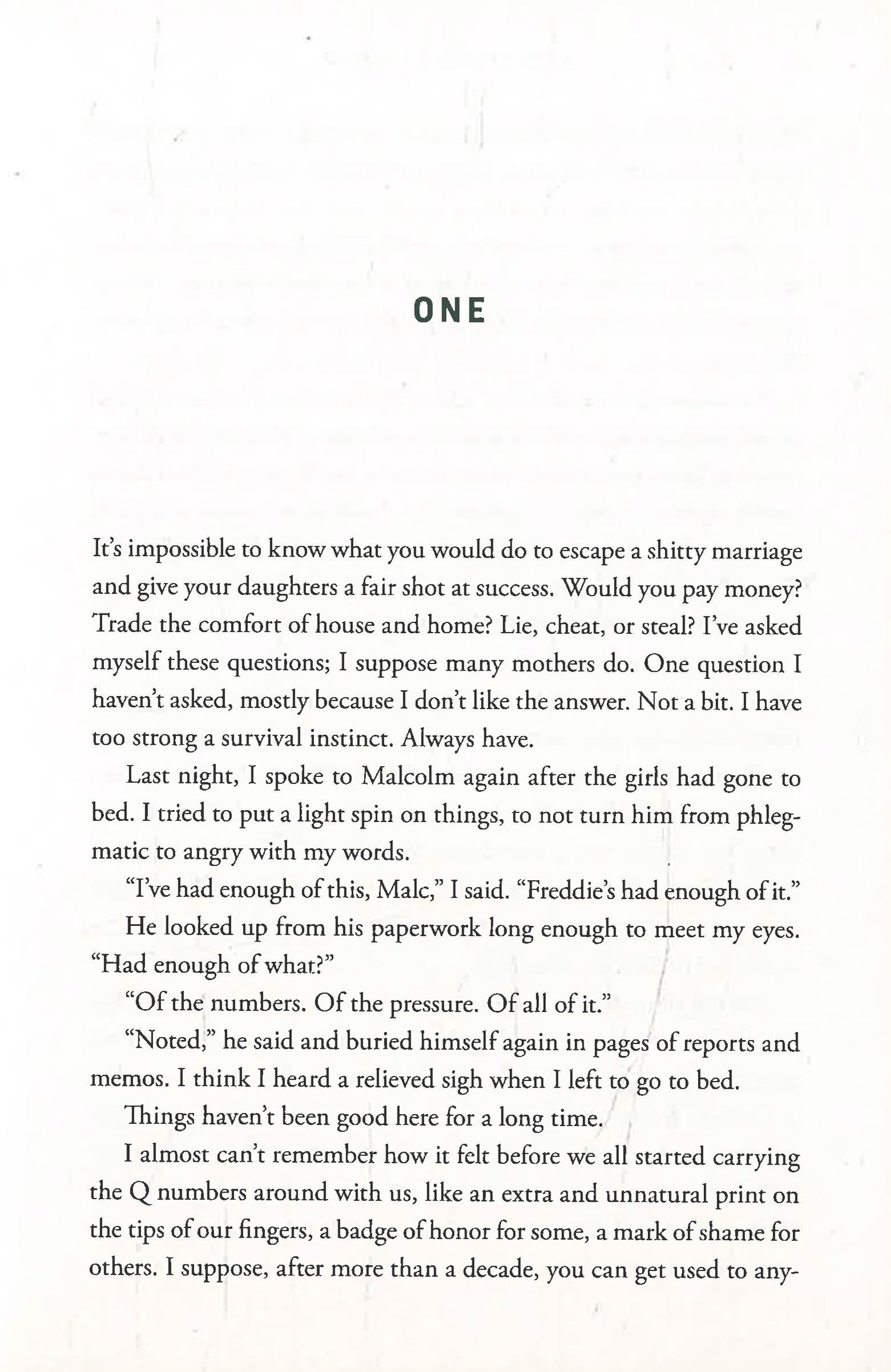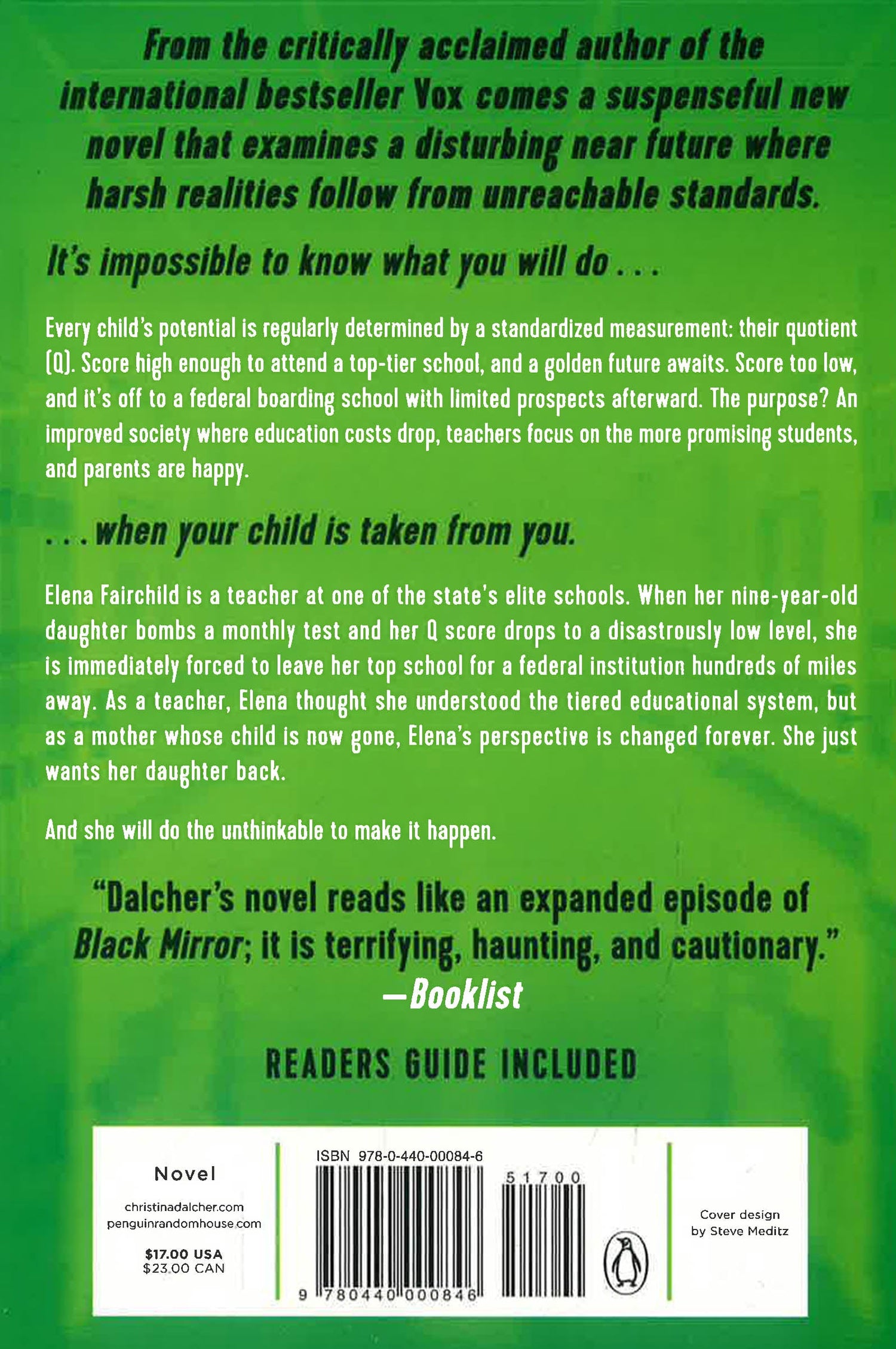 Elena Fairchild is a teacher at one of the state's elite schools. When her nine-year-old daughter bombs a monthly test and her Q score drops to a disastrously low level, she is immediately forced to leave her top school for a federal institution hundreds of miles away. As a teacher, Elena thought she understood the tiered educational system, but as a mother whose child is now gone, Elena's perspective is changed forever. She just wants her daughter back.