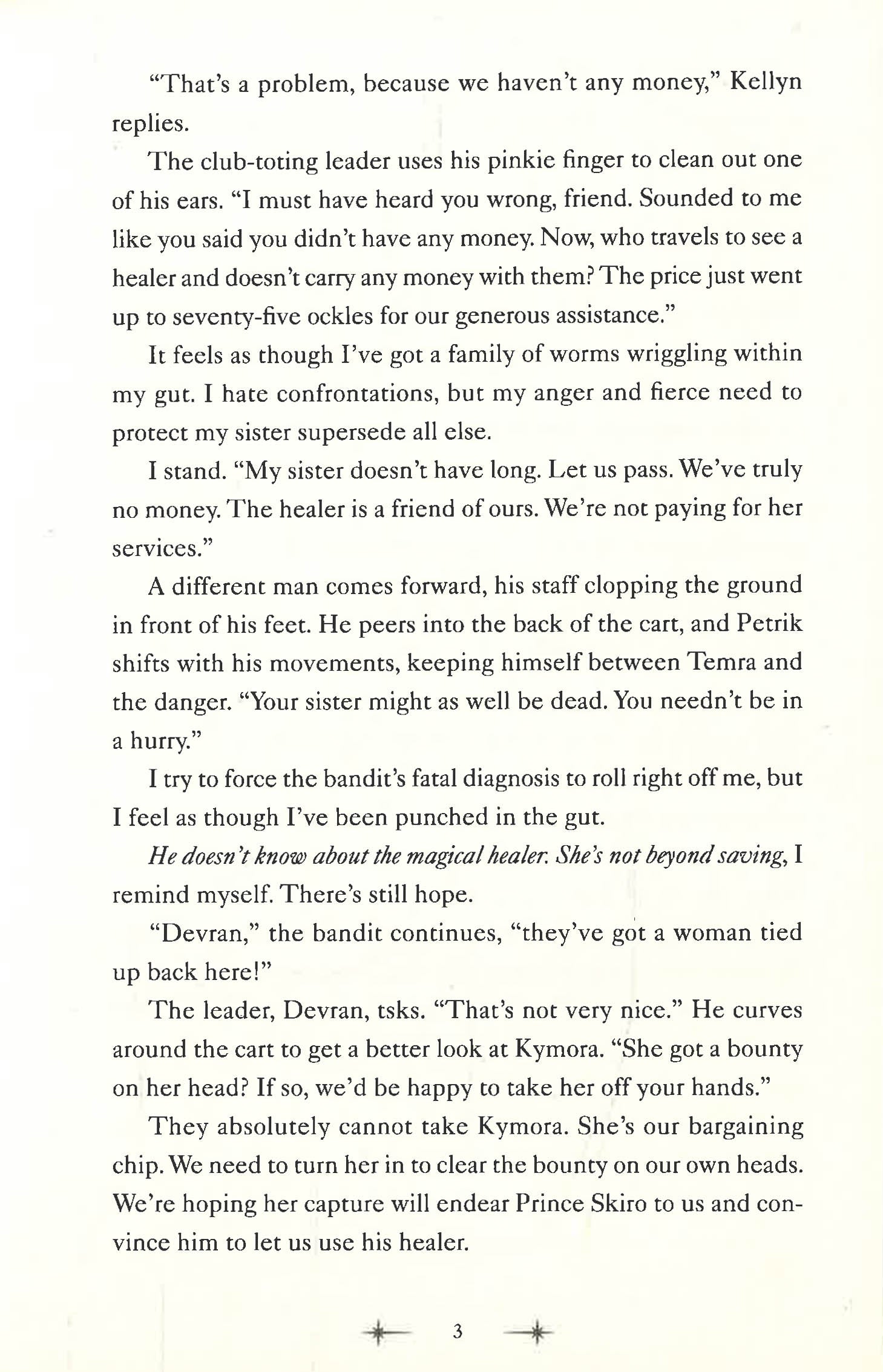 Eighteen-year-old Ziva is in a race against time. Her beloved sister was gravely wounded in a battle with a fearsome warlord, and now she and her friends, the handsome mercenary Kellyn and young scholar Petrik, have only days to find a healer to save her life.