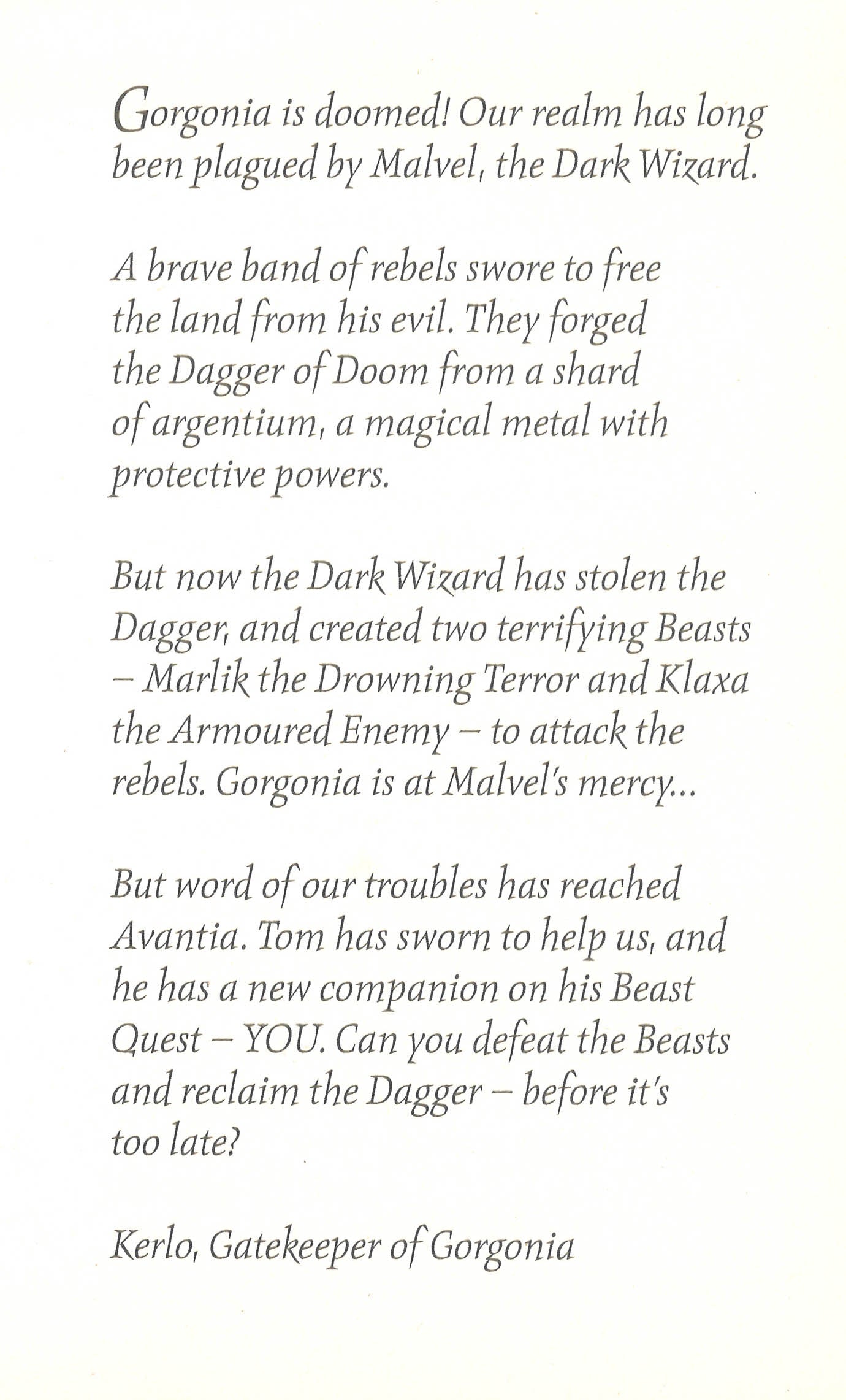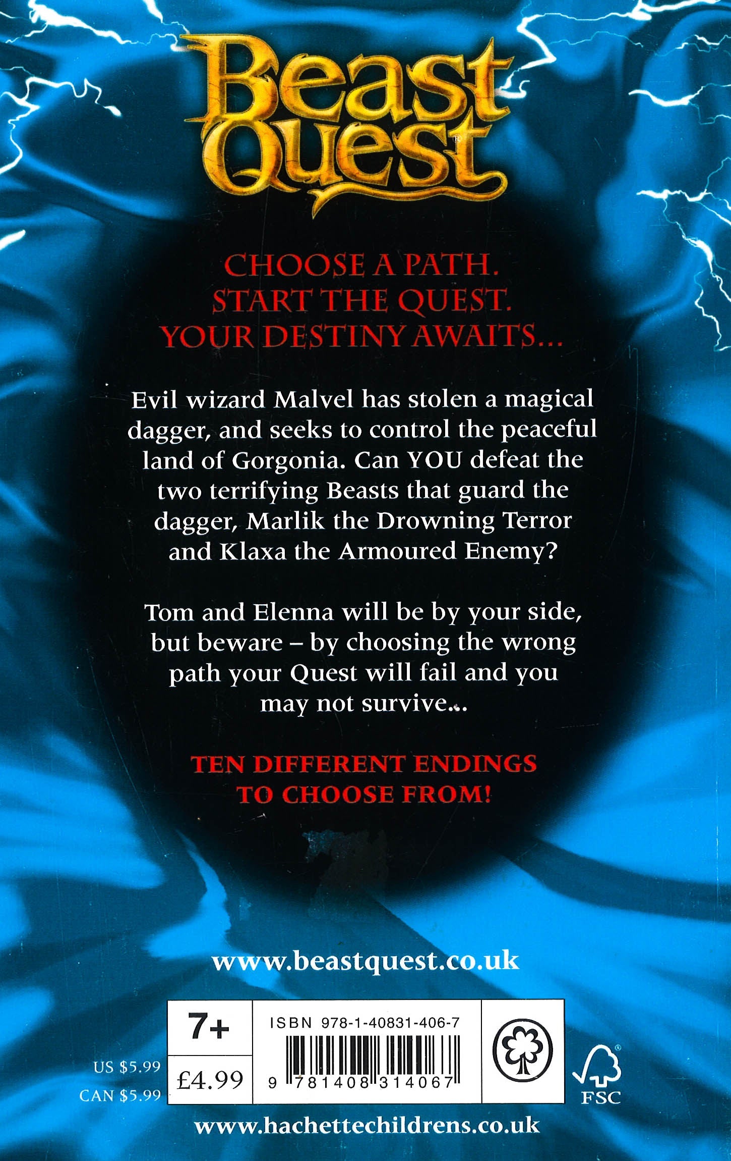 Evil wizard Malvel has stolen a magical dagger, and seeks to control the peaceful land of Gorgonia. Can YOU defeat the two terrifying Beasts that guard the dagger, Marlik the Drowning Terror and Klaxa the Armoured Enemy? Tom and Elenna will be by your side, but beware - by choosing the wrong path your Quest will fail and you may not survive...