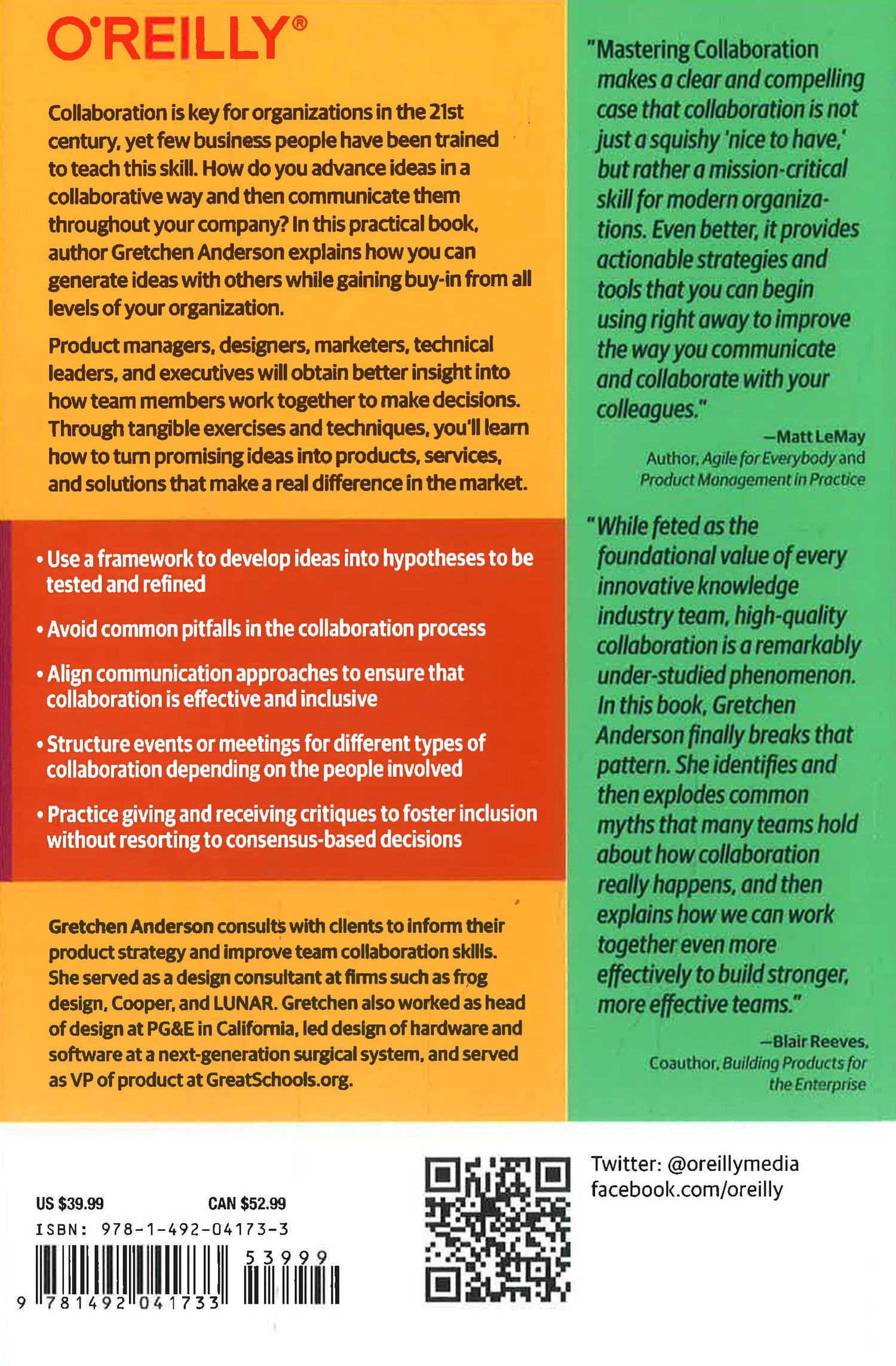 Collaboration is key for organizations in the 21st century, yet few business people have been trained to teach this skill. How do you advance ideas in a collaborative way and then communicate them throughout your company? In this practical book, author Gretchen Anderson shows you how to generate ideas with others while gaining buy-in from all levels of your organization. Product managers, designers, marketers, technical leaders, and executives will obtain better insight into how team members work together to make decisions. Through tangible exercises and techniques, you’ll learn how to turn promising ideas into products, services, and solutions that make a real difference in the market. Use a framework to develop ideas into hypotheses to be tested and refined Avoid common pitfalls in the collaboration process Align communication approaches to ensure that collaboration is effective and inclusive Structure events or meetings for different types of collaboration depending on the people involved Practice giving and receiving critiques to foster inclusion without resorting to consensus-based decisions