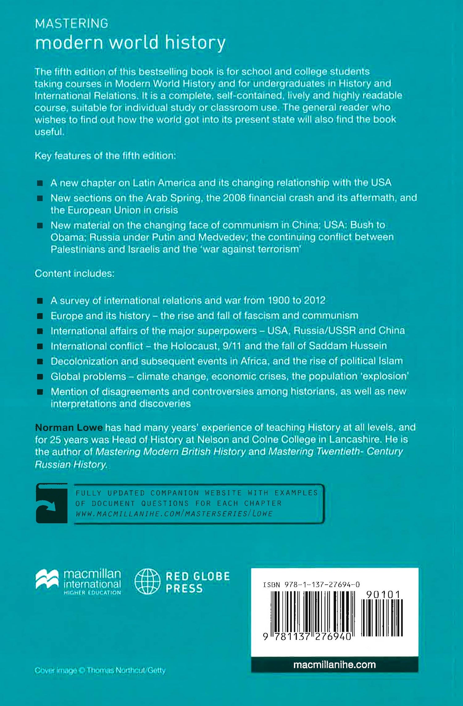 The fifth edition of this bestselling book is for school and college students taking courses in Modern World History and for undergraduates in History and International Relations. It is a complete, self-contained, lively and highly readable course, suitable for individual study or classroom use. The general reader who wishes to find out how the world got into its present state will also find the book useful. Key features of the fifth edition: - A new chapter on Latin America and its changing relationship with the USA - New sections on the Arab Spring, the 2008 financial crash and its aftermath, and the European Union in crisis - New material on the changing face of communism in China; USA: Bush to Obama; Russia under Putin and Medvedev; the continuing conflict between Palestinians and Israelis and the 'war against terrorism' Content includes: - A survey of international relations and war from 1900 to 2012 - Europe and its history - the rise and fall of fascism and communism - International affairs of the major superpowers - USA, Russia/USSR and China - International conflict -The Holocaust, 9/11 and the fall of Saddam Hussein - Decolonization and subsequent events in Africa, and the rise of political Islam - Global problems - climate change, economic crises, the population 'explosion' - Mention of disagreements and controversies among historians, as well as new interpretations and discoveries Norman Lowe has had many years' experience of teaching History at all levels, and for 25 years was Head of History at Nelson and Colne College in Lancashire. He is the author of Mastering Modern British History and Mastering Twentieth Century Russian History. Accompanying online resources for this title can be found at bloomsburyonlineresources.com/mastering-modern-world-history-5e. These resources are designed to support teaching and learning when using this textbook and are available at no extra cost.