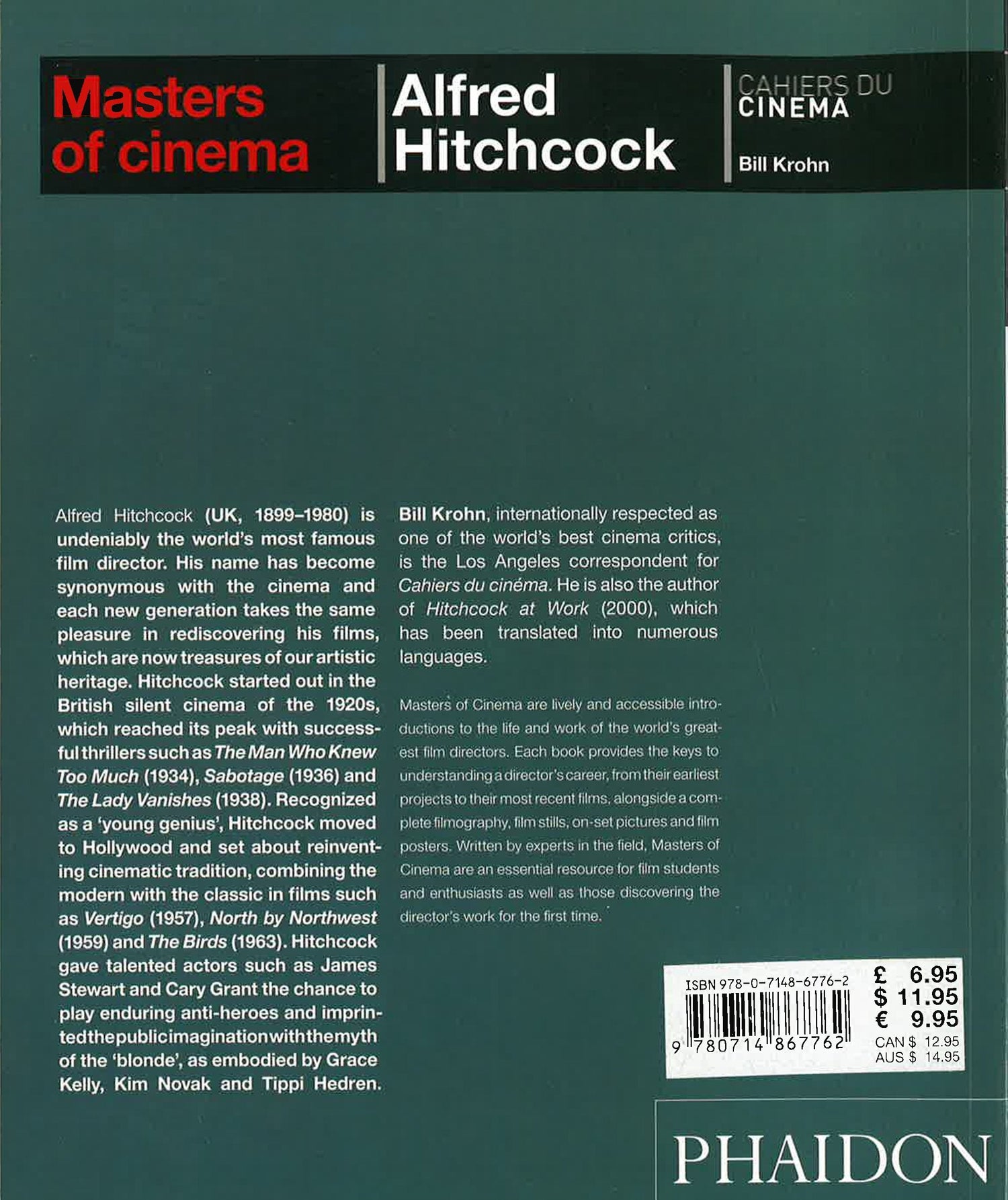 Alfred Hitchcock (UK, 1899-1980) is undeniably the world's most famous film director. His name has become synonymous with the cinema, and each new generation takes the same pleasure in rediscovering his films, which are now treasures of our artistic heritage. Hitchcock started out in the British silent cinema of the 1920s, which reached its peak with successful thrillers such as The Man Who Knew Too Much (1934), Sabotage (1936) and The Lady Vanishes (1938). Recognized as a `young genius', Hitchcock moved to Hollywood and set about reinventing cinematic tradition, combining the modern with the classic in films such as Vertigo (1957), North by Northwest (1959) and The Birds (1963). Hitchcock gave talented actors such as James Stewart and Cary Grant the chance to play enduring antiheroes and imprinted the public imagination with the myth of the `blonde', as embodied by Grace Kelly, Kim Novak and Tippi Hedren.