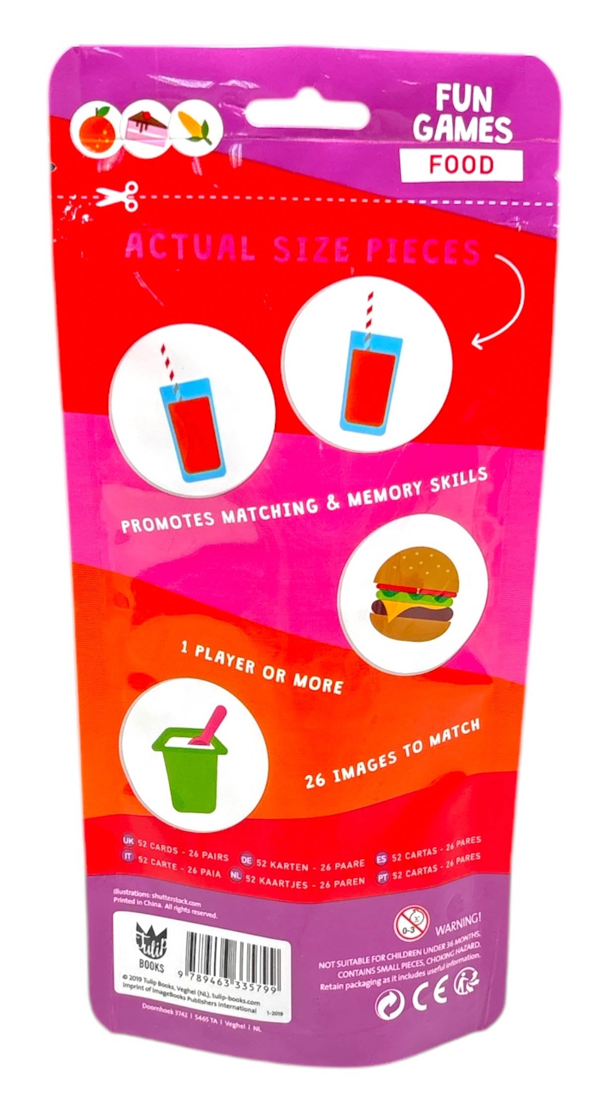 Match the pairs are classic games in a colourful bag. The bag contains 52 round cardboard card to make 26 pairs. Bright illustrations for young children.