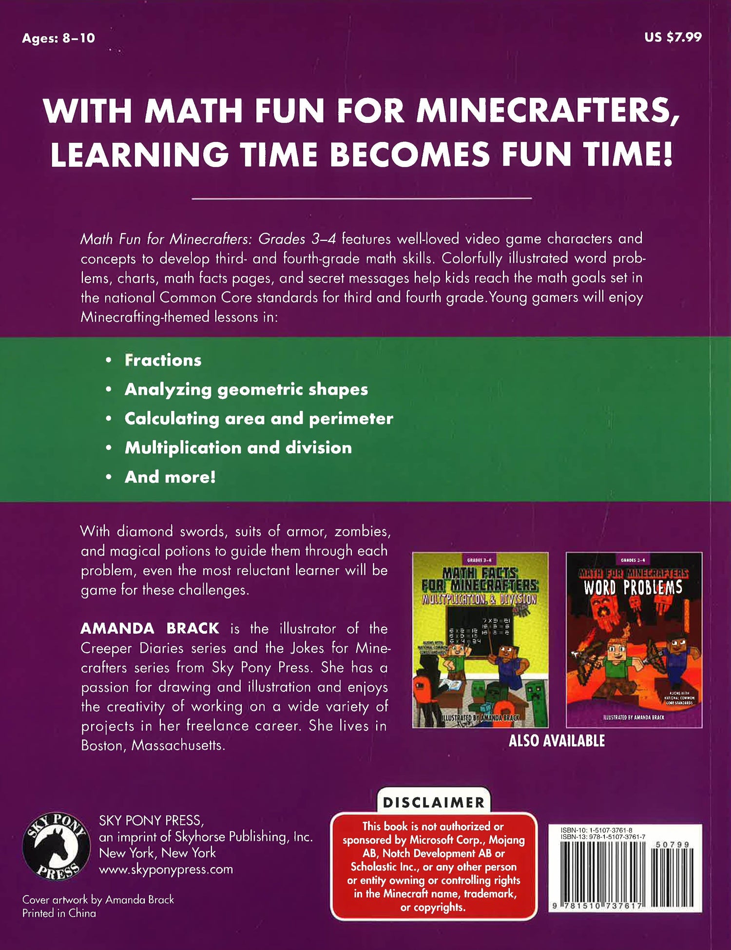 Math Fun for Minecrafters: Grades 3-4 features well-loved video game characters and concepts to develop third and fourth grade math skills. Colorfully-illustrated word problems, charts, math facts pages, and secret messages help kids reach the math goals set in the National Common Core standards for third and fourth grade.