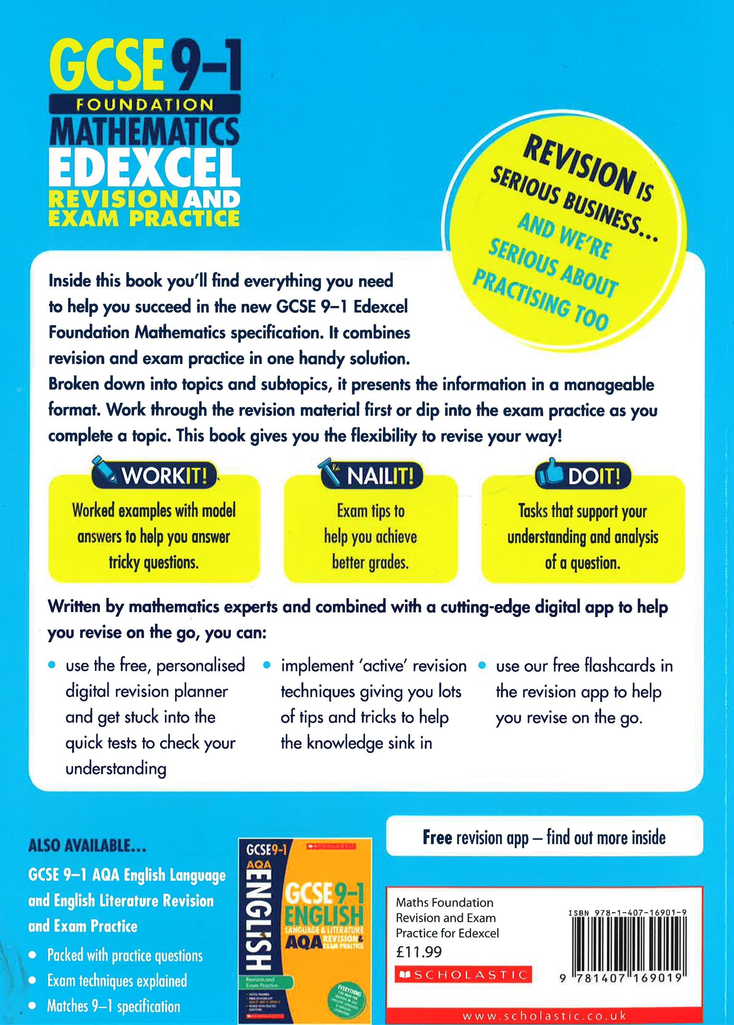This Revision and Practice Book is designed to support you in the development of good exam techniques. It is packed full of tips and tasks to make sure you really know and understand the key revision points. With loads of practice questions (and answers) for every topic, and written by experienced teachers and revision experts - you can't go wrong! Board: Edexcel Examination: Maths Foundation Specification: GCSE 9-1 Type: Practice and Revision (includes answers) (Please note this title is also available for AQA and All Boards) "The Scholastic resources go into far more detail than some of the other revision guides we have used and I've not seen any other resources that have an app linked to them. We would definitely recommend the resources to other schools. Everything you need to revise is in one place to enable students to work independently." Dave Richardson, Deputy Head [in reference to the GCSE English Language & Literature and Mathematics revision guides and exam practice books] Aim for the highest pass with Scholastic's GCSE Grades 9-1 series of Practice and Revision books. Our revision guides cover GCSE exam topics at greater depth, with clear and focused explanations of tricky topics and questions that offer additional challenge and when they are combined with our exam practice books which are packed with hundreds of GCSE exam-style questions covering the key topics for every subject, you'll have everything you need in one book! It's not just practice, each book also includes tips, advice and regular progress checks to boost confidence and help students apply key revision strategies. Every book also includes at least one full practice paper for authentic exam preparation. Full answers are provided to help students check their progress. Taking an active, stepped approach, our guides include popular 'It!' features giving students opportunities to self-test their understanding and apply their knowledge as they study. Do it! Active practice to help you retain key facts Nail it! Examiner tips to help you get better grades Snap it! Read it, snap it on your phone, revise it...helps you retain key facts Stretch it! Support for the really tough stuff that will get you higher grades Work it! Exam questions broken down into manageable steps "What they thought was especially clever is the resources 'knowing' the day of their exam, and then highlighting what they needed to do and when in the days and weeks leading up to it. That captured them there and then." Dave Richardson, Deputy Head [Read the full case study from Brentwood County High School] The accompanying app helps you revise on-the-go: Use the free, personalised digital revision planner and get stuck into the quick tests to check your understanding Download our free revision cards which you can save to your phone to help you revise on the go Implement 'active' revision techniques - giving you lots of tips and tricks to help the knowledge sink in Other subjects covered by Scholastic's Practice and Revision series: Maths Foundation, Maths Higher, SPAG, English Language and Literature, Biology, Chemistry, Physics, Combined Science and Geography