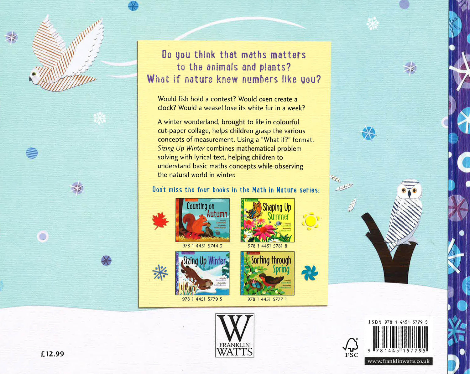 Journey into the natural world and discover that numbers, patterns and shapes can be found by observing everyday plants and animals What if animals and plants knew maths, just like us? Would snowflakes all fall from the same height in the sky? Would otters spread themselves evenly across lakes? Would groundhogs be aware of the date? In Sizing Up Winter, nature comes to life to help children grasp concepts of time and measurement Maths in Nature is a lovely four book series, which explores seasonal and natural beauty through maths concepts, which are made engaging with energetic and colourful paper collage illustrations, poetic language and thoughtful questions. Each book also includes nature notes at the end, which give more information about the animals and plants featured in the seasonal scenes. Colourful, cut- paper collage art uniquely evokes the natural world, while two levels of text - one a lyrical story, the other asking children to problem-solve - bring the reader to a full understanding of the maths concept being covered. The engaging "What if?" format of these informational picture books is sure to delight five- to seven-year-olds.
