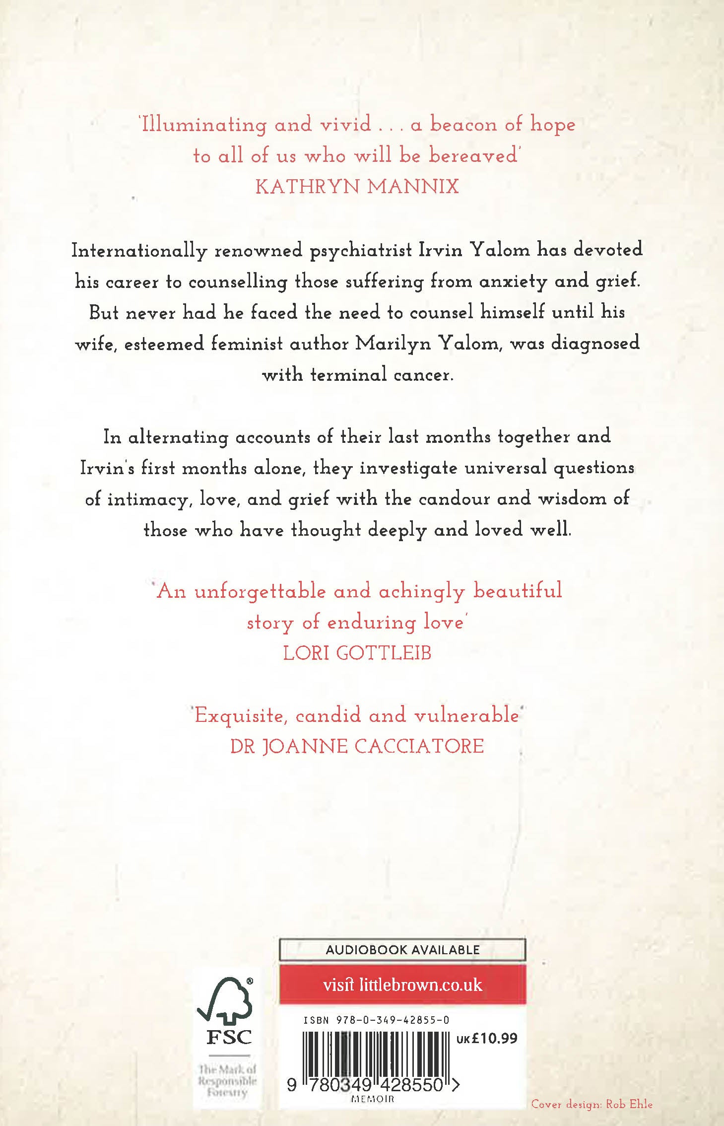 In alternating accounts of their last months together and Irvin's first months alone, they offer us a rare window into coping with death and the loss of one's beloved. The Yaloms had rare blessings - a loving family, a beautiful home, a large circle of friends, avid readers around the world, and a long, fulfilling marriage - but they faced death as we all do. With the candour and wisdom of those who have thought deeply and loved well, they investigate universal questions of intimacy, love, and grief.