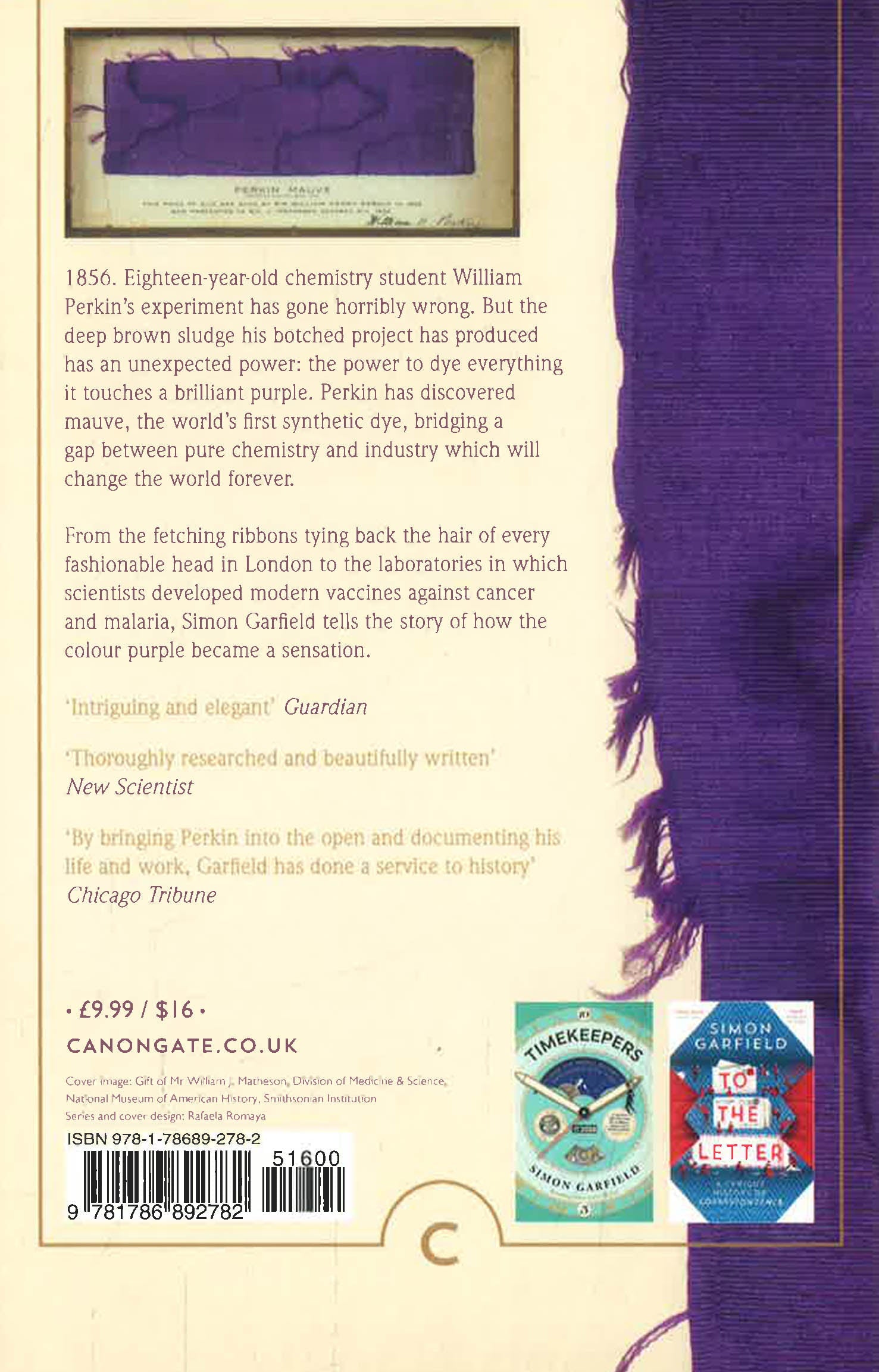1856. Eighteen-year-old chemistry student William Perkin's experiment has gone horribly wrong. But the deep brown sludge his botched project has produced has an unexpected power: the power to dye everything it touches a brilliant purple. Perkin has discovered mauve, the world's first synthetic dye, bridging a gap between pure chemistry and industry which will change the world forever.From the fetching ribbons tying back the hair of every fashionable head in London to the laboratories in which scientists developed modern vaccines against cancer and malaria, Simon Garfield tells the story of how the colour purple became a sensation.