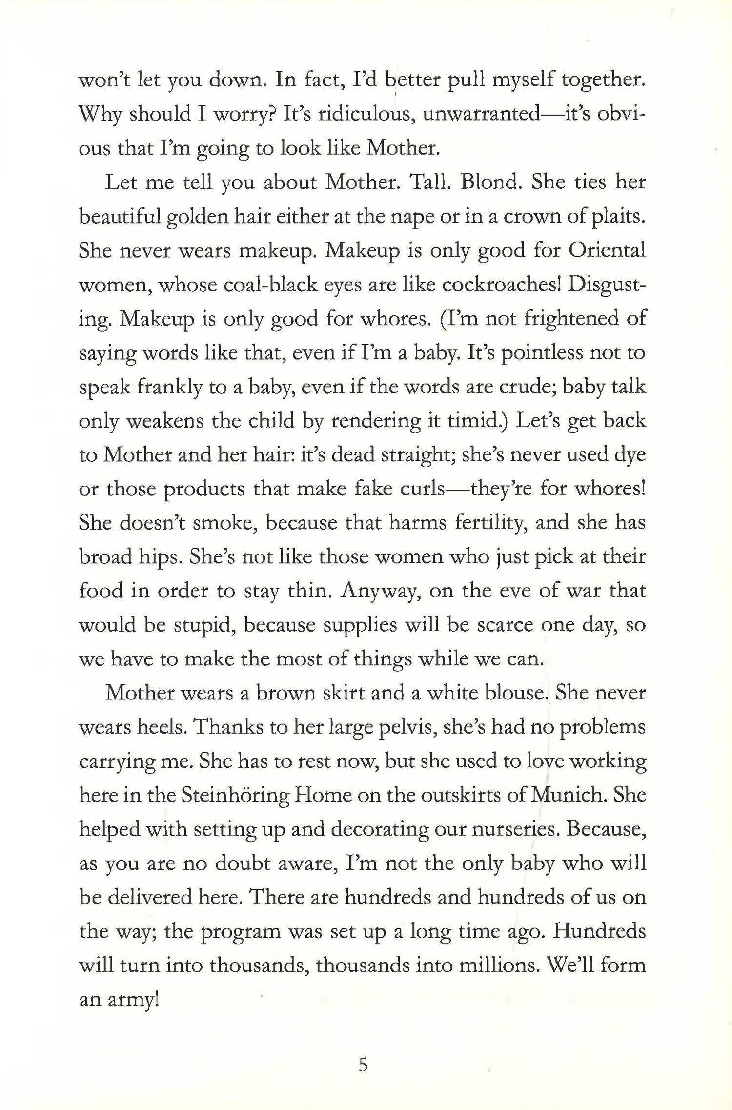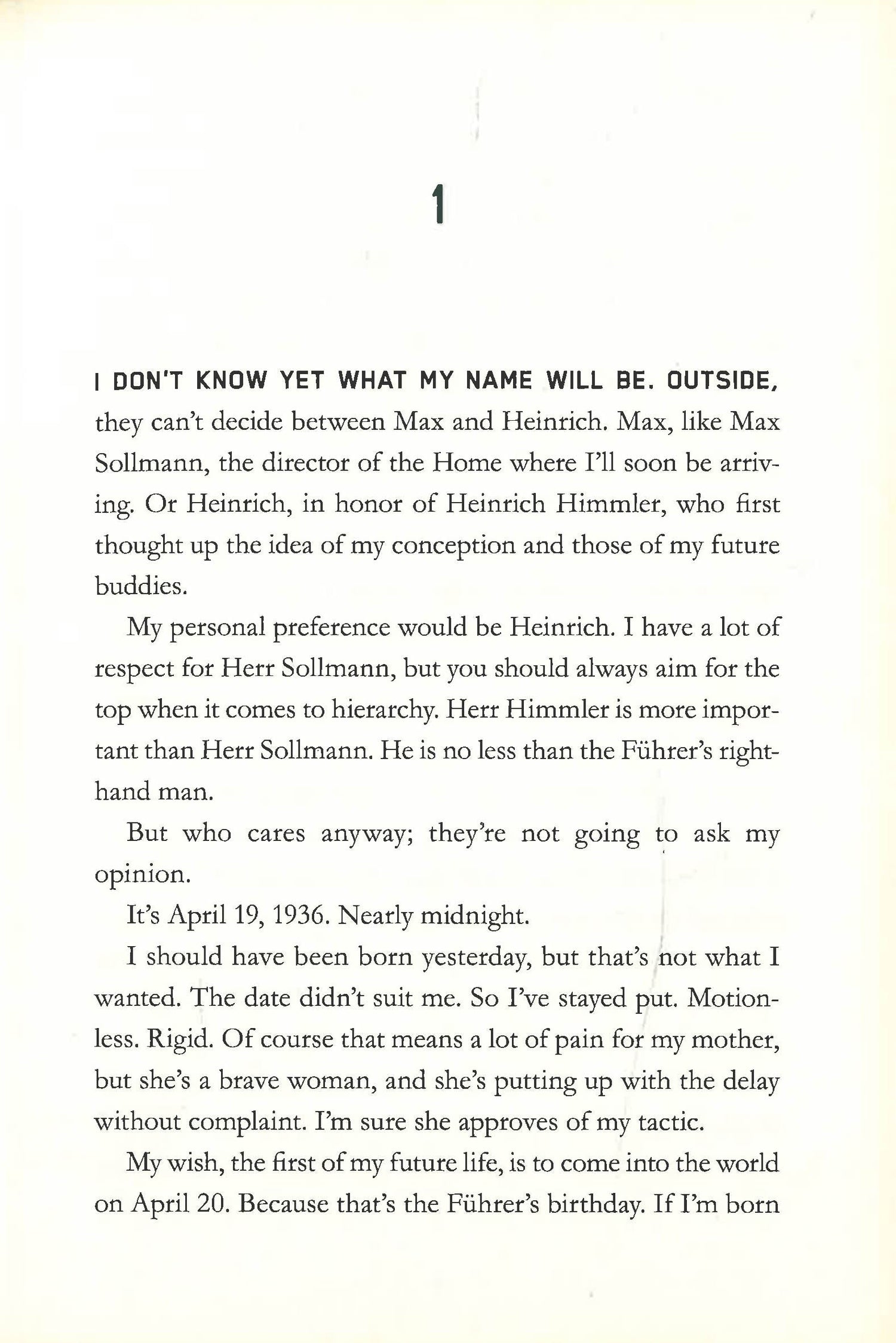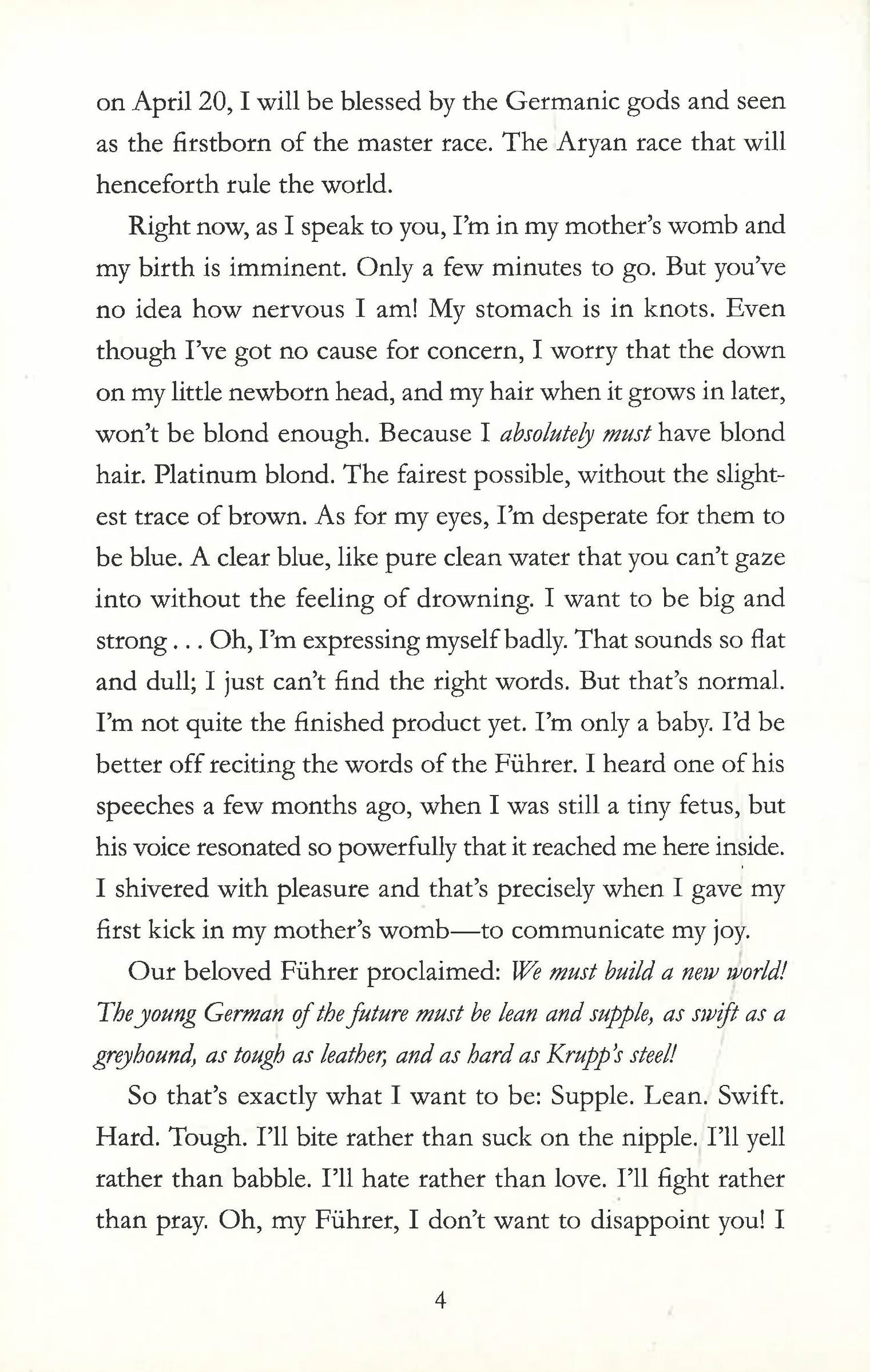 Nazi Germany. 1936. The Lebensborn program is going strong as German women are carefully selected by the Nazis and recruited to give birth to new representatives of the Aryan race. Inside one of these women is Max, a fetus waiting to be born and fulfill his destiny as the perfect Aryan. Max is taken away from his birth mother as soon as he enters the world. He will be raised under the leadership and ideologies of the Nazi Party. As he grows up without a mom, without any affection or tenderness, according to Nazi educational precepts, he soon becomes the mascot of the program. But things don't go according to plan.Originally published in French, this touching, illuminating, and heartbreaking book has been translated for an English-speaking audience.A Neal Porter Book