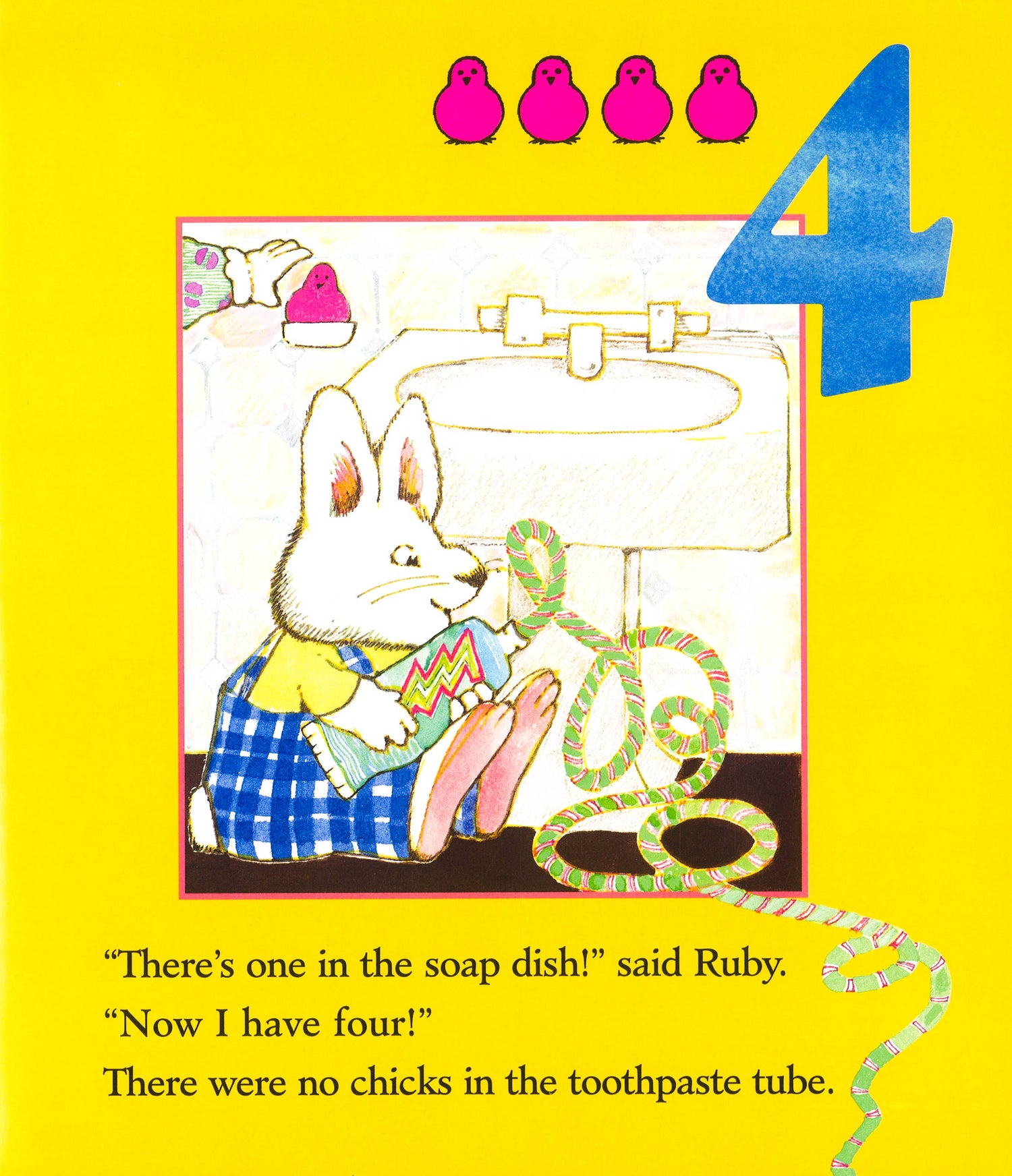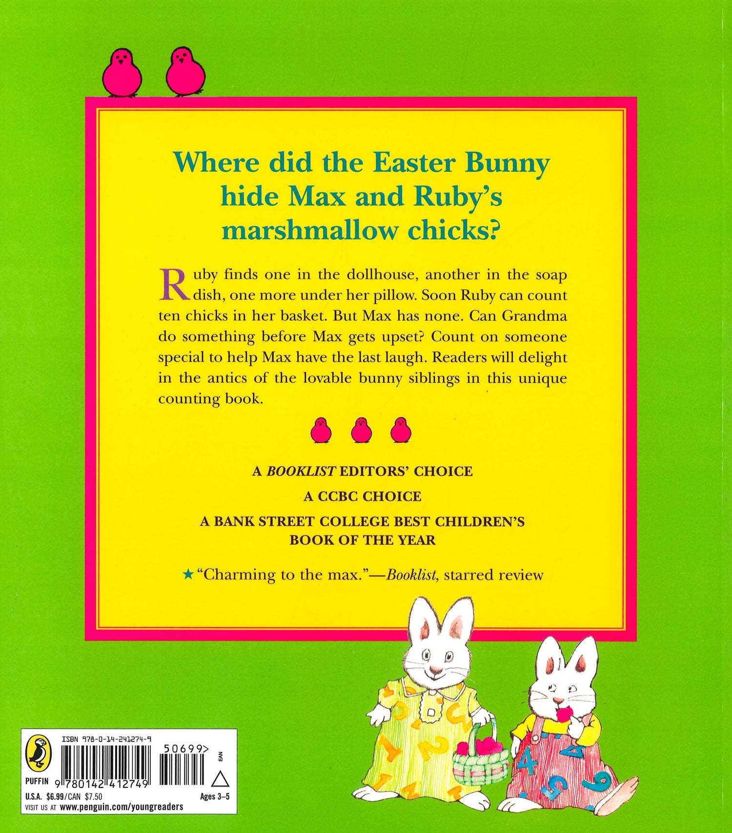 Max and Ruby are back in a counting book sure to tickle the funny bone of very young readers. When the Easter Bunny decides to hide the contents of their Easter baskets, Max and Ruby set out on a hunt for the missing marshmallow chicks, which are here, there, and everywhere. Ruby is finding all the chicks, but count on Max to have the last laugh!