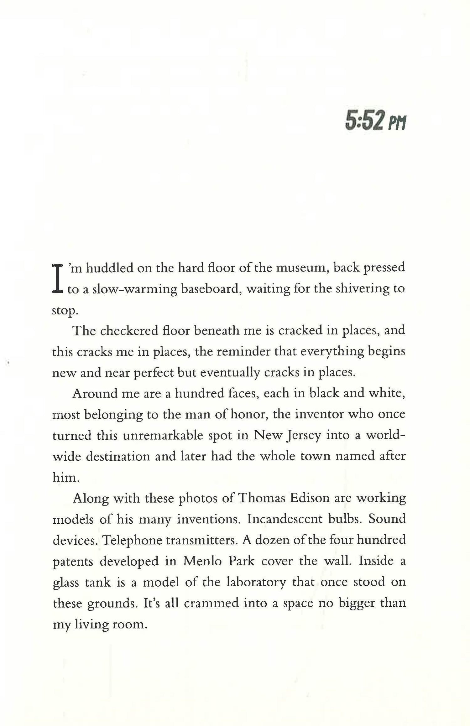 Tegan Everly is painfully shy. Known around school simply as the girl with the weird hand, she's only her true outspoken self with her friend Neel, and right now they're not exactly talking. When Tegan is ambushed by her mom with a truth she can't face, she flees home in a snowstorm, finding refuge at a forgotten local attraction -- the tiny Thomas Edison museum.